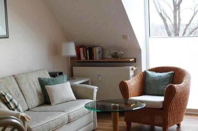 Das helle Wohn- und Esszimmer bietet Ihnen eine bequeme Sofaecke mit TV-Gerät und Zugang zum möblierten Balkon. Von hier haben Sie einen seitlichen Blick auf die Kirchsee und die Wismarbucht und können entspannte Stunden verbringen.