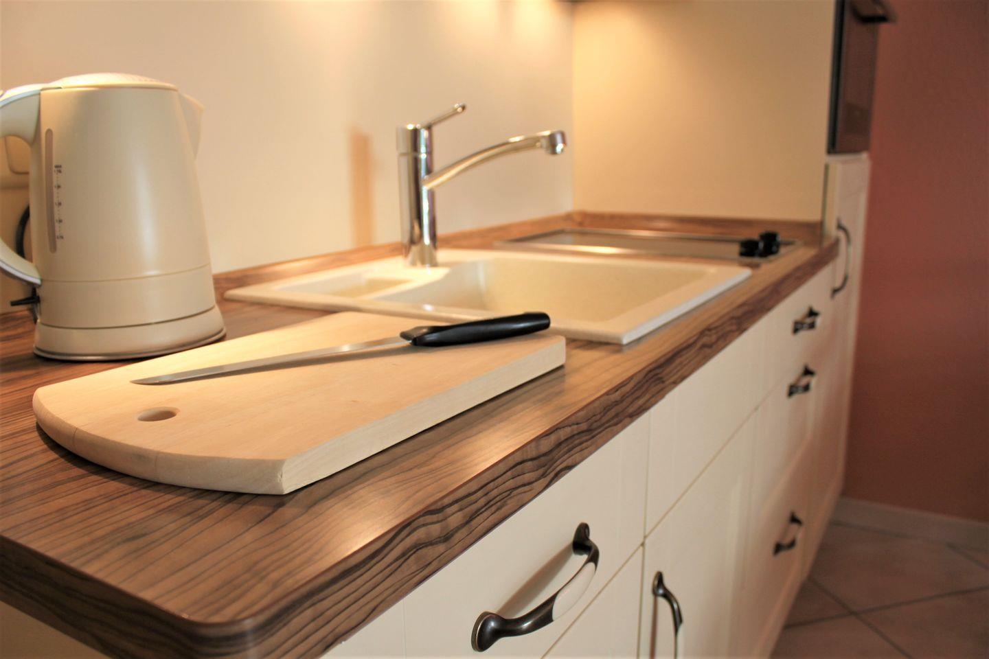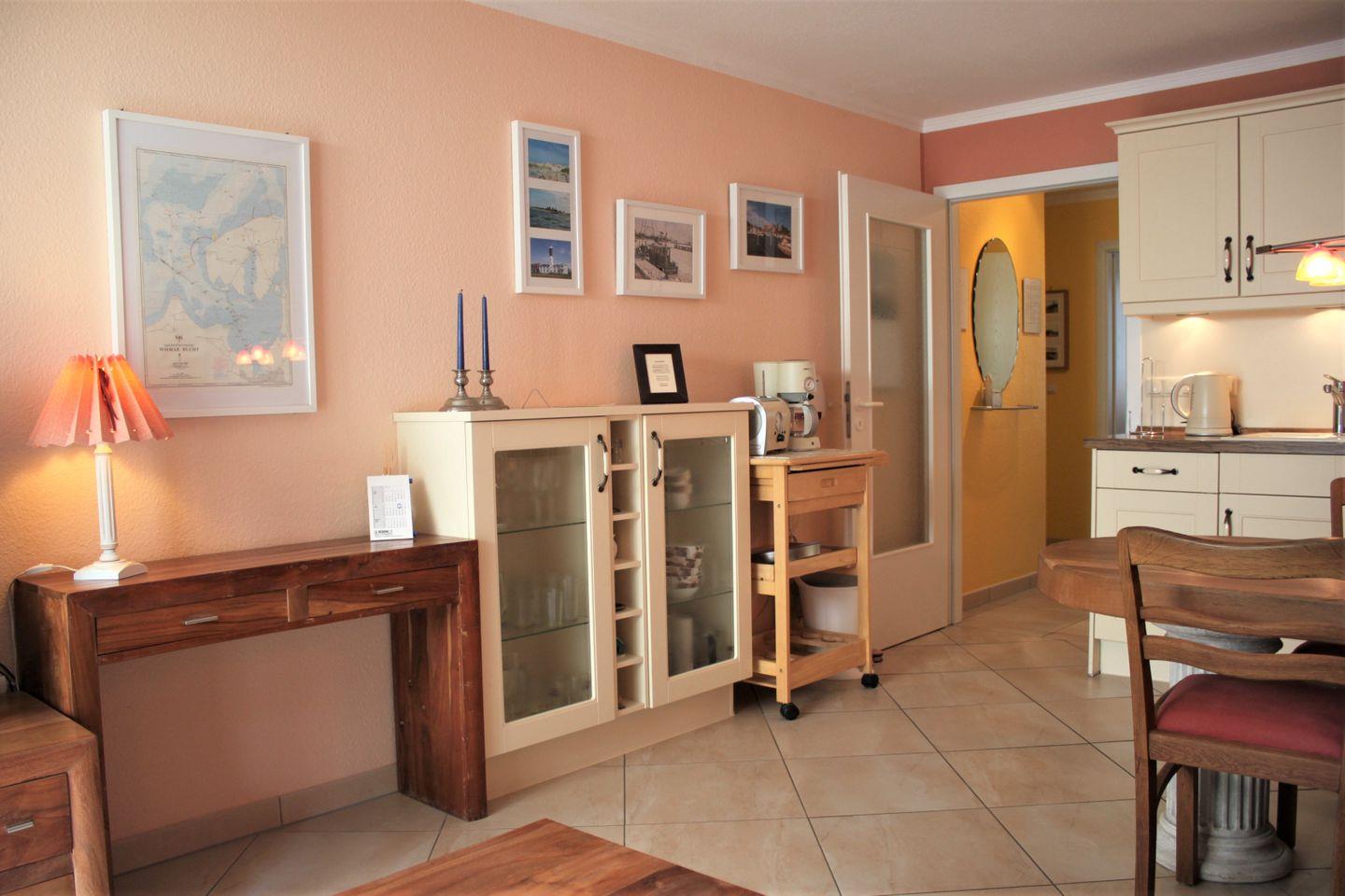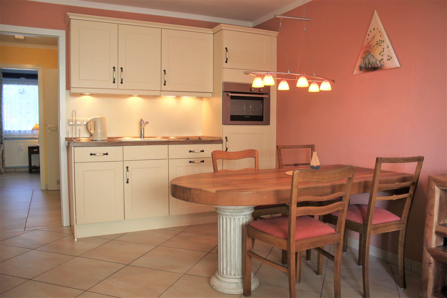 Ein offen gestaltetes Wohn- und Esszimmer mit Sofa, TV-Gerät, WLAN und Esstisch laden zu schönen Stunden ein. Über den Zugang zum möblierten Balkon haben Sie einen seitlichen Blick auf die Kirchsee. Die Küche ist ebenfalls in den Raum integriert und verfügt über eine Geschirrspülmaschine, einen Kühlschrank mit Gefrierfach, Wasserkocher, einen kleinen Herd mit Backofen und bietet gute Möglichkeiten für eine Selbstversorgung.