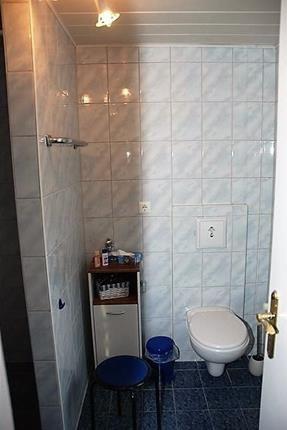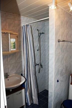 Das Badezimmer verfügt über eine ebenerdige Dusche, ein Waschbecken und ein WC.