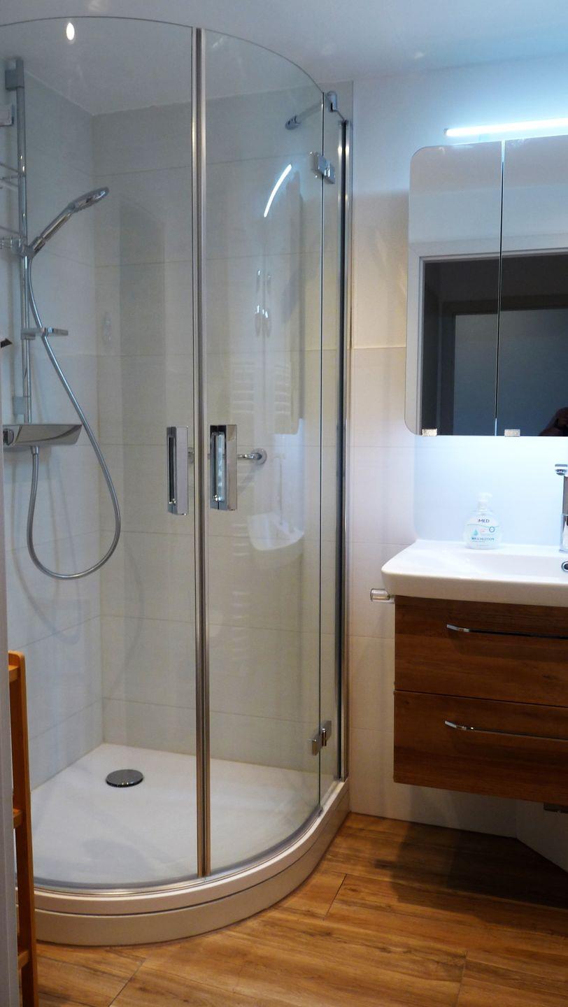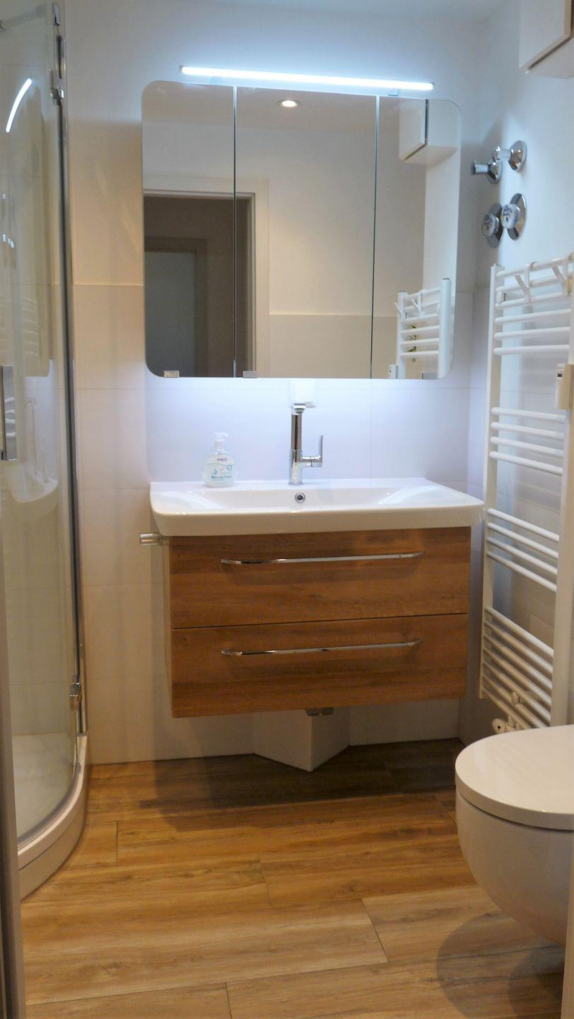 Im modernen Badezimmer stehen Ihnen eine Dusche, ein Handtuchheizkörper, ein Waschtisch mit Föhn und ein WC zur Verfügung.