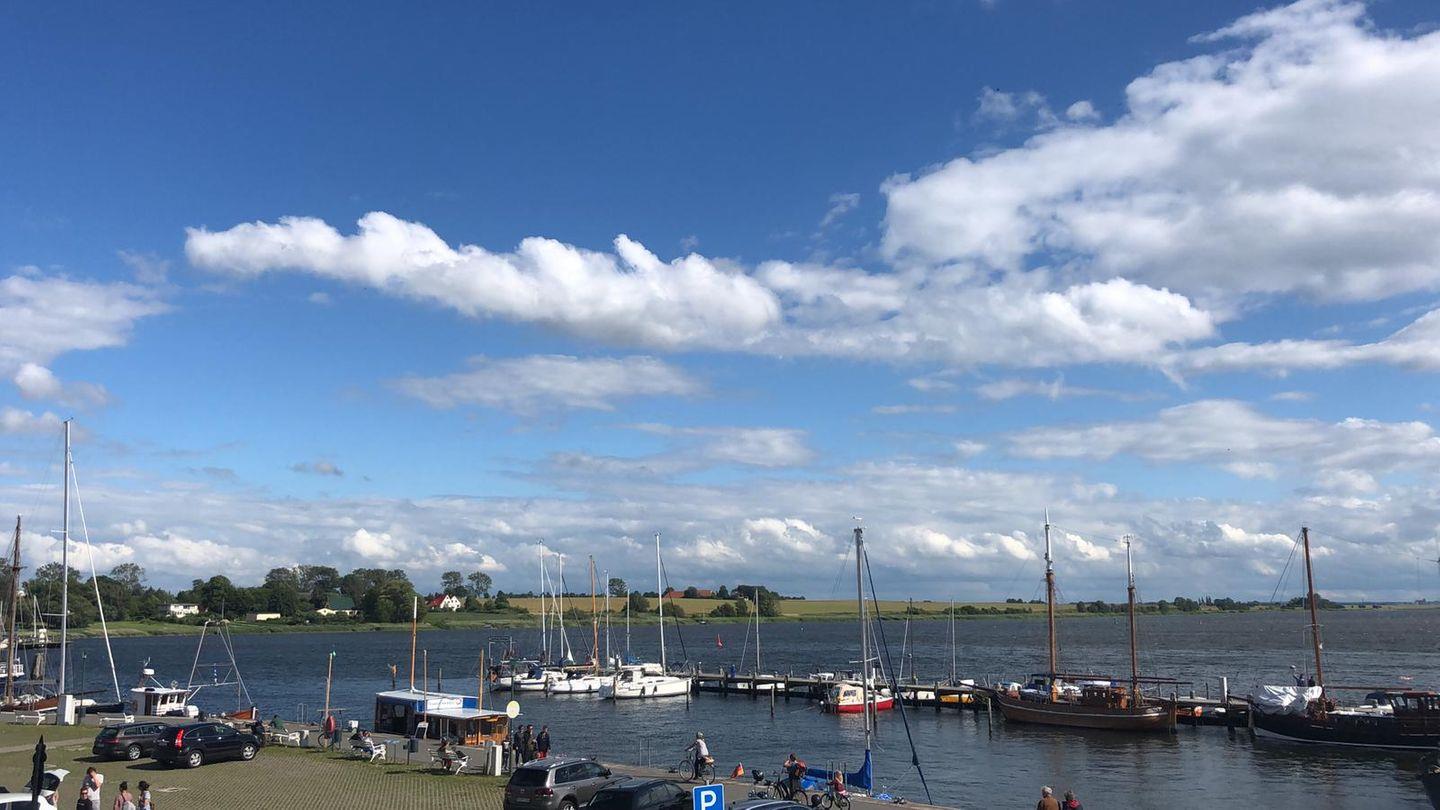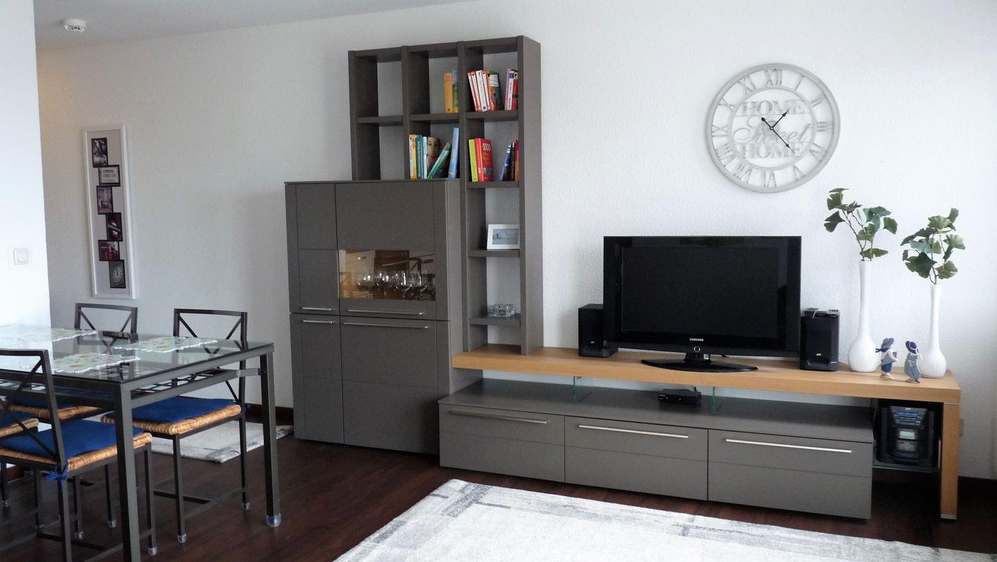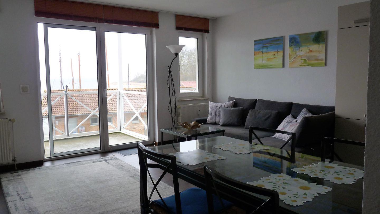 Über einen kleinen Flur mit Garderobe gelangen Sie in das helle, moderne Wohn- und Esszimmer. Hier verfügen Sie über eine komfortable Sofaecke mit TV-Gerät, Wlan und Zugang zum möblierten Balkon, von dem aus Sie einen fantastischen Weitblick auf die Kirchsee der Wismarbucht, das Treiben im Hafen und auf die Backsteinkirche haben.