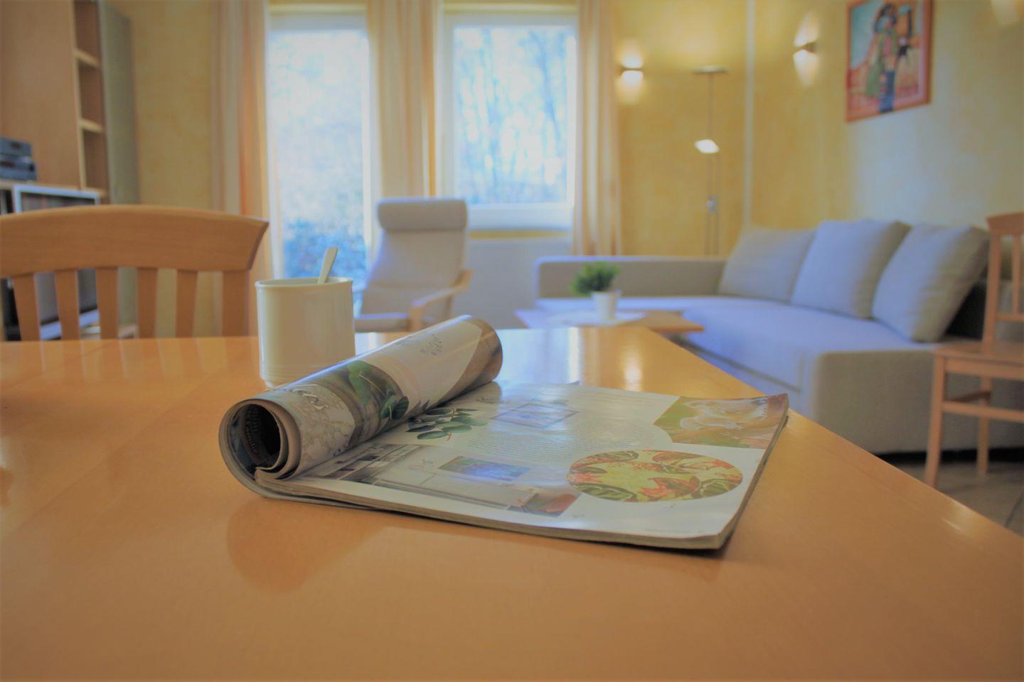 In diesem gemütlich eingerichteten 2-Zimmer-Appartement werden sich bis zu 4 Personen wohlfühlen. Die Wohnung liegt im Erdgeschoss des Wohnhauses und ist hell und freundlich möbliert. Der Wohnraum ist mit dem Essbereich und einer integrierten Küche kombiniert und verfügt neben einer Sofaecke mit TV-Gerät, WLAN und Kamin auch über einen großzügigen Esstisch und den Zugang zur möblierten Terrasse. Hier verbringen Sie in den Sommermonaten entspannte Stunden mit Blick in die Natur.