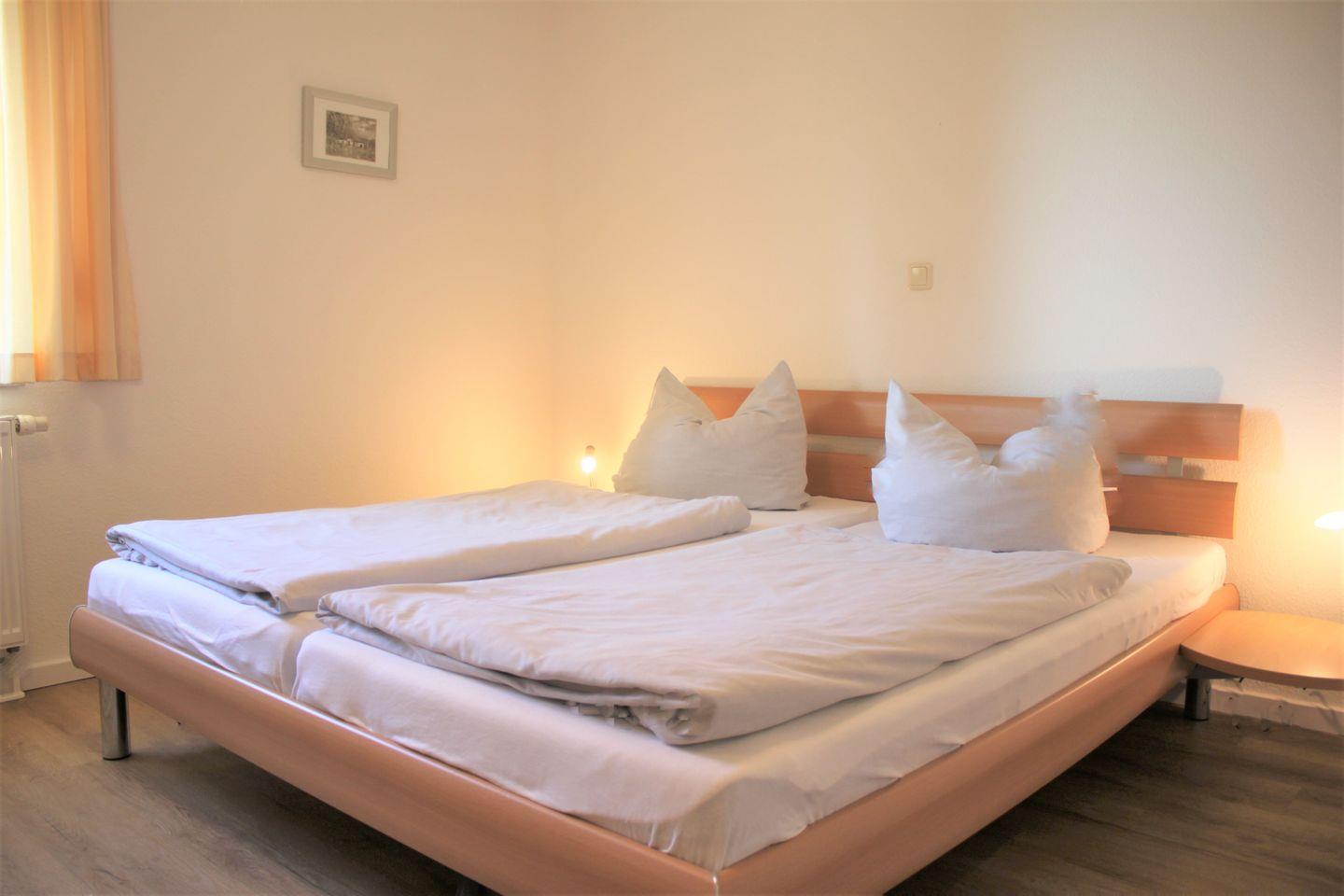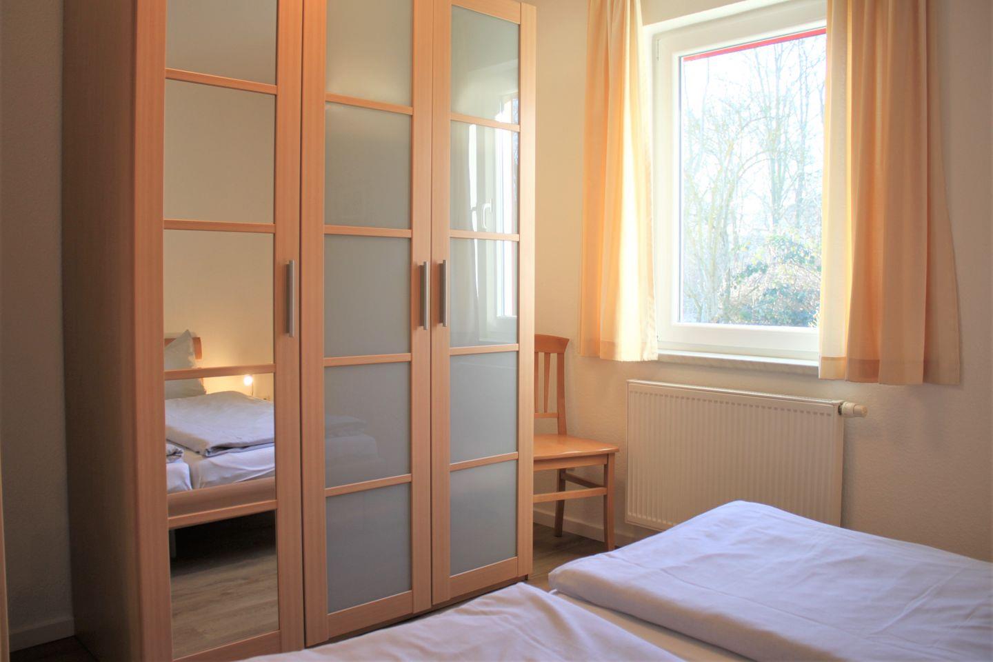 Das separate Schlafzimmer ist mit einem Doppelbett und Kleiderschrank möbliert. Zwei weitere Schlafplätze bietet die ausziehbare Couch im Wohnzimmer.