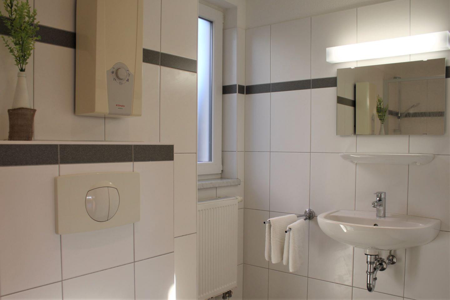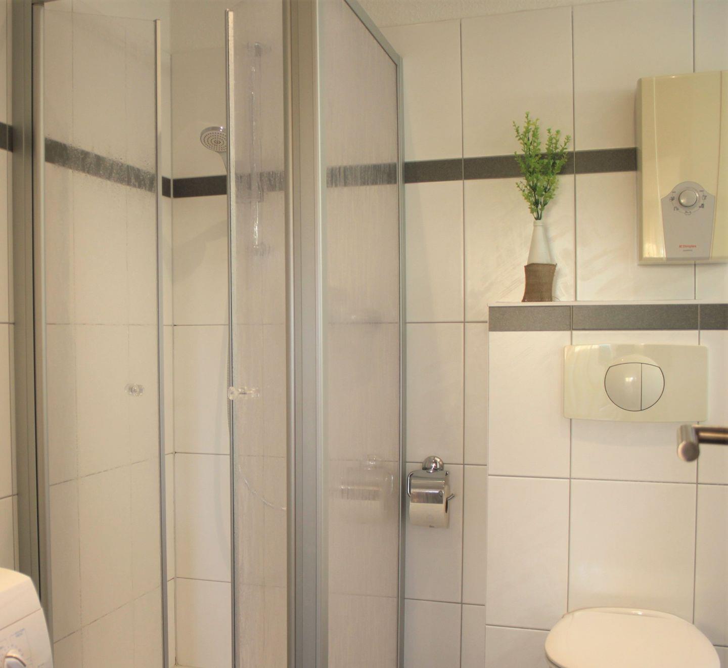 Das Badezimmer mit Fenster ist mit einer Dusche, einem Waschtisch, WC und einer Waschmaschine ausgestattet.