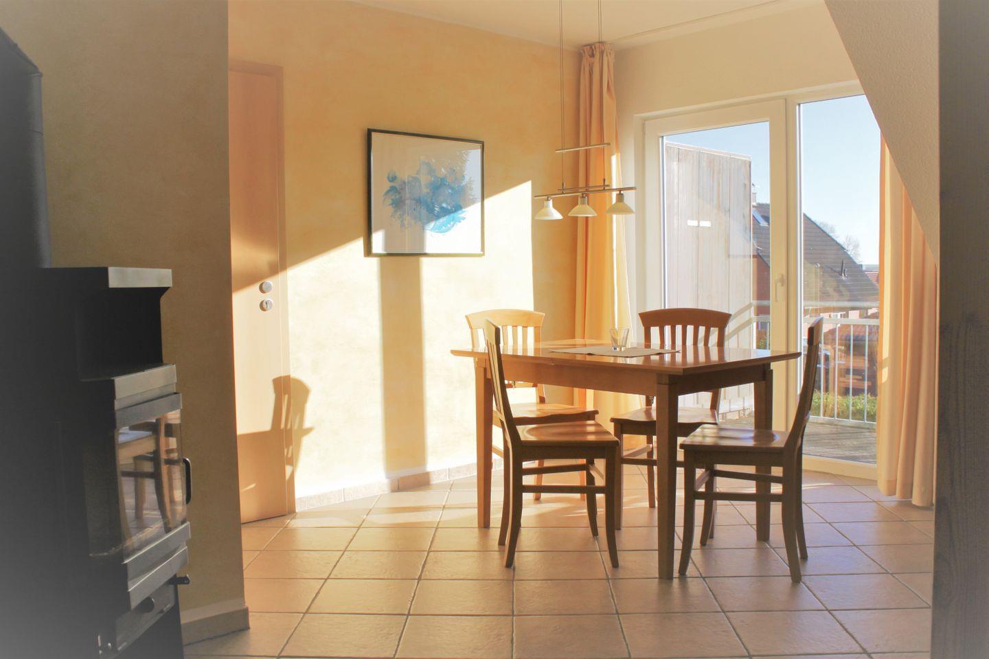Der helle und großzügige Wohnbereich ist gemütlich eingerichtet und in offener Bauweise gestaltet. Der Essbereich und die gut ausgestattete Küche finden dort ebenfalls Platz. Eine Sofaecke mit TV- Gerät, WLAN und Kamin sorgen für entspannte Stunden und auch auf dem saisonal möblierten Balkon können Sie die Seele baumeln lassen.