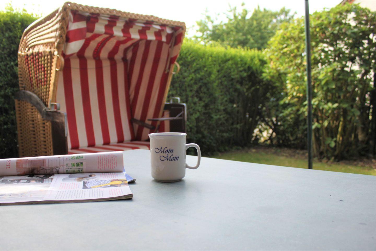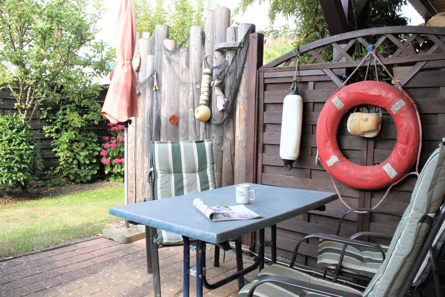 Das großzügige Wohnzimmer ist mit einem gemütlichen Sofa, einem TV-Gerät, Kamin und Zugang zur möblierten Terrasse ausgestattet. Hier verbringen Sie entspannte Stunden im Strandkorb mit Blick auf den angrenzenden kleinen Garten.