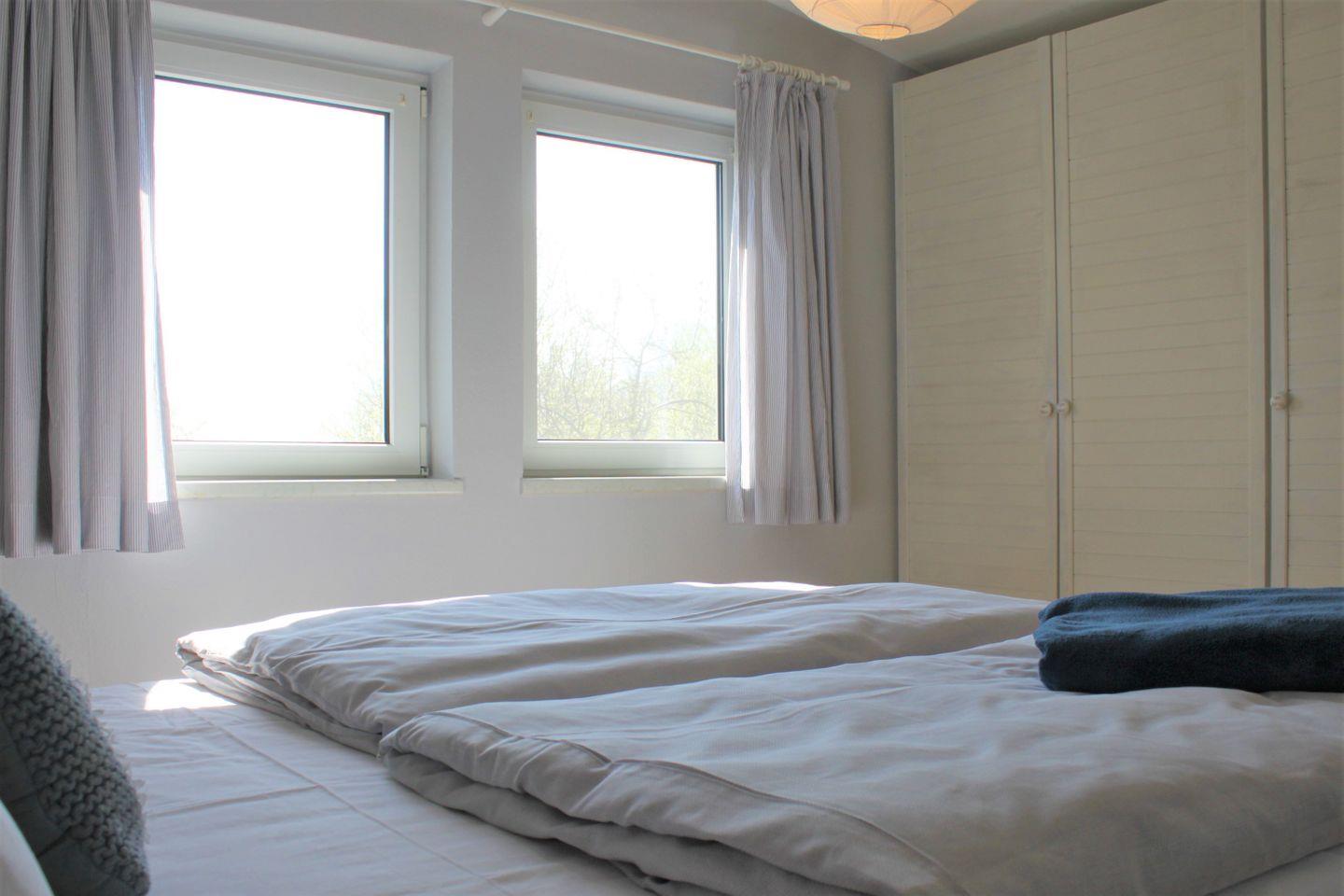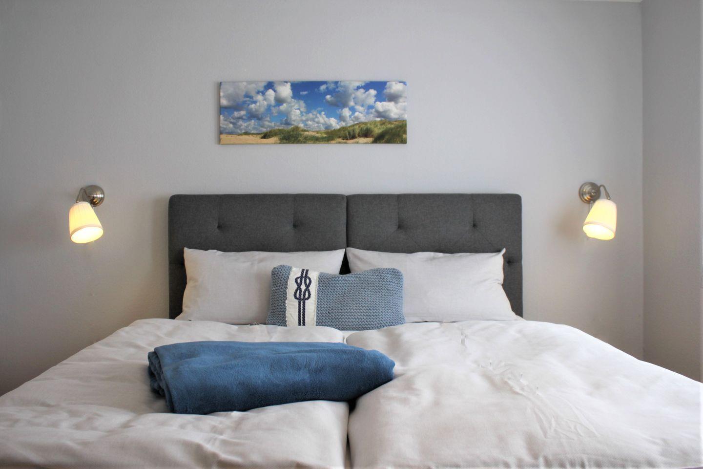 Über eine Wendeltreppe gelangen Sie in die obere Etage des Ferienhauses. Hier befinden sich die beiden separaten Schlafzimmer, die entweder mit einem Doppelbett (160x200cm mit durchgängiger Matratze) oder einem Einzelbett und jeweils genügend Stauraum für Ihre Garderobe möbliert sind.
