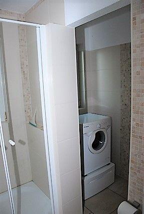 Das Badezimmer hält eine Dusche, einen Waschtisch, Föhn und Waschmaschine für Sie bereit.