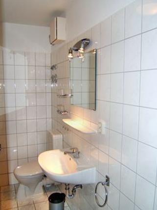 Das Badezimmer verfügt über eine Dusche, einen Waschtisch und ein WC.