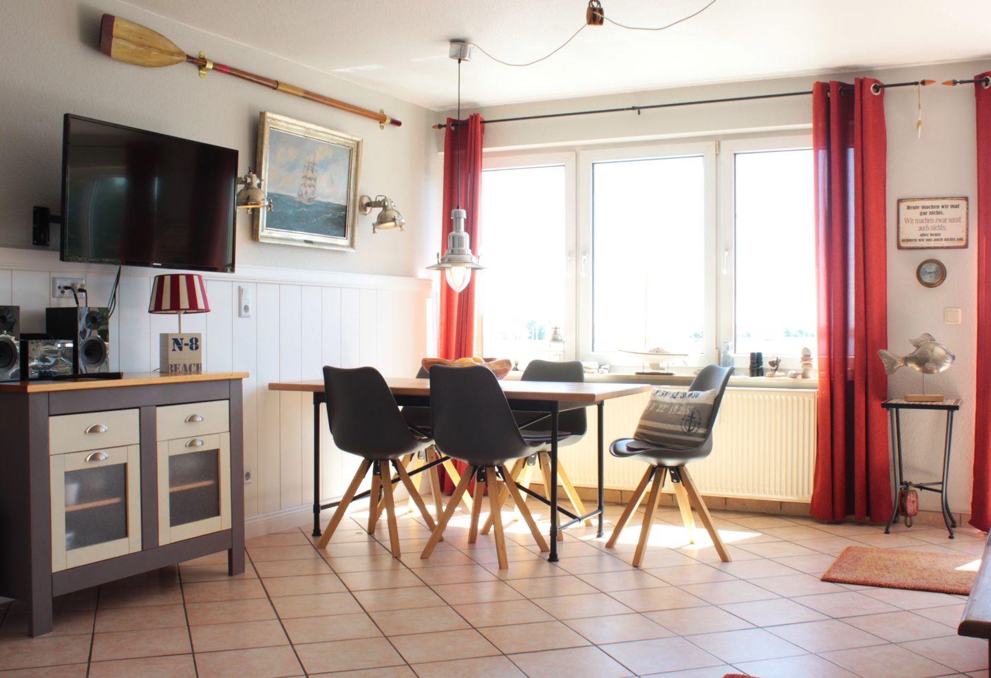 Die Wohnung bietet Ihnen über 2 Etagen viel Platz, Rückzugsmöglichkeiten und Gemütlichkeit. In der unteren Etage befindet sich neben dem gemütlichen Wohnzimmer auch das Badezimmer und ein Schlafzimmer mit Doppelstockbett. Die integrierte Küche im schönen Landhausstil verfügt unter anderem über einen Herd mit Backofen, eine Geschirrspülmaschine, einen Kühlschrank mit Gefrierfach und diverse Kleingeräte wie Kaffeemaschine, Wasserkocher und Toaster und lädt zu gemütlichen Kochabenden ein.