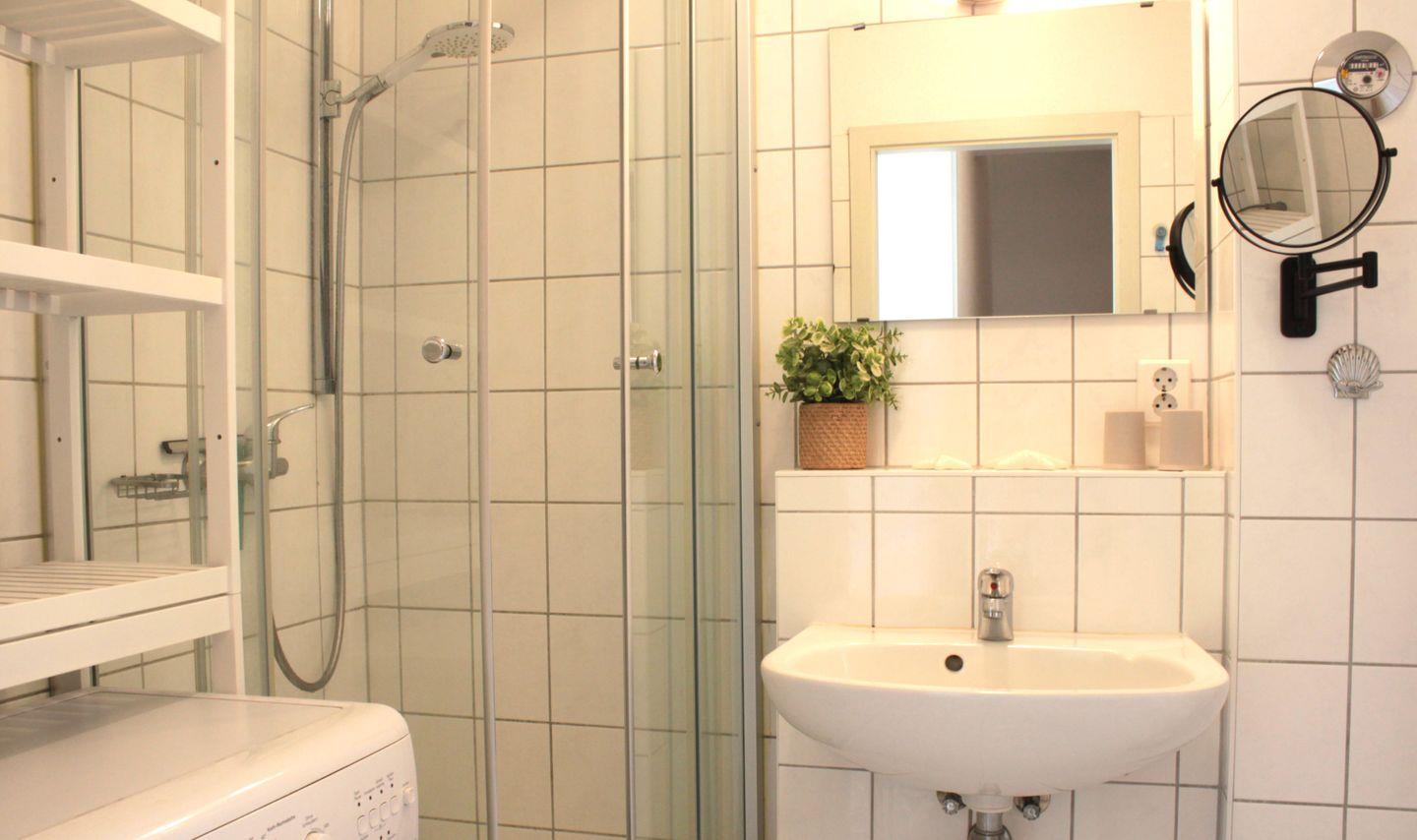Das Badezimmer in der unteren Etage der Wohnung bietet Ihnen eine Dusche, ein Waschbecken, eine Waschmaschine und ein WC.