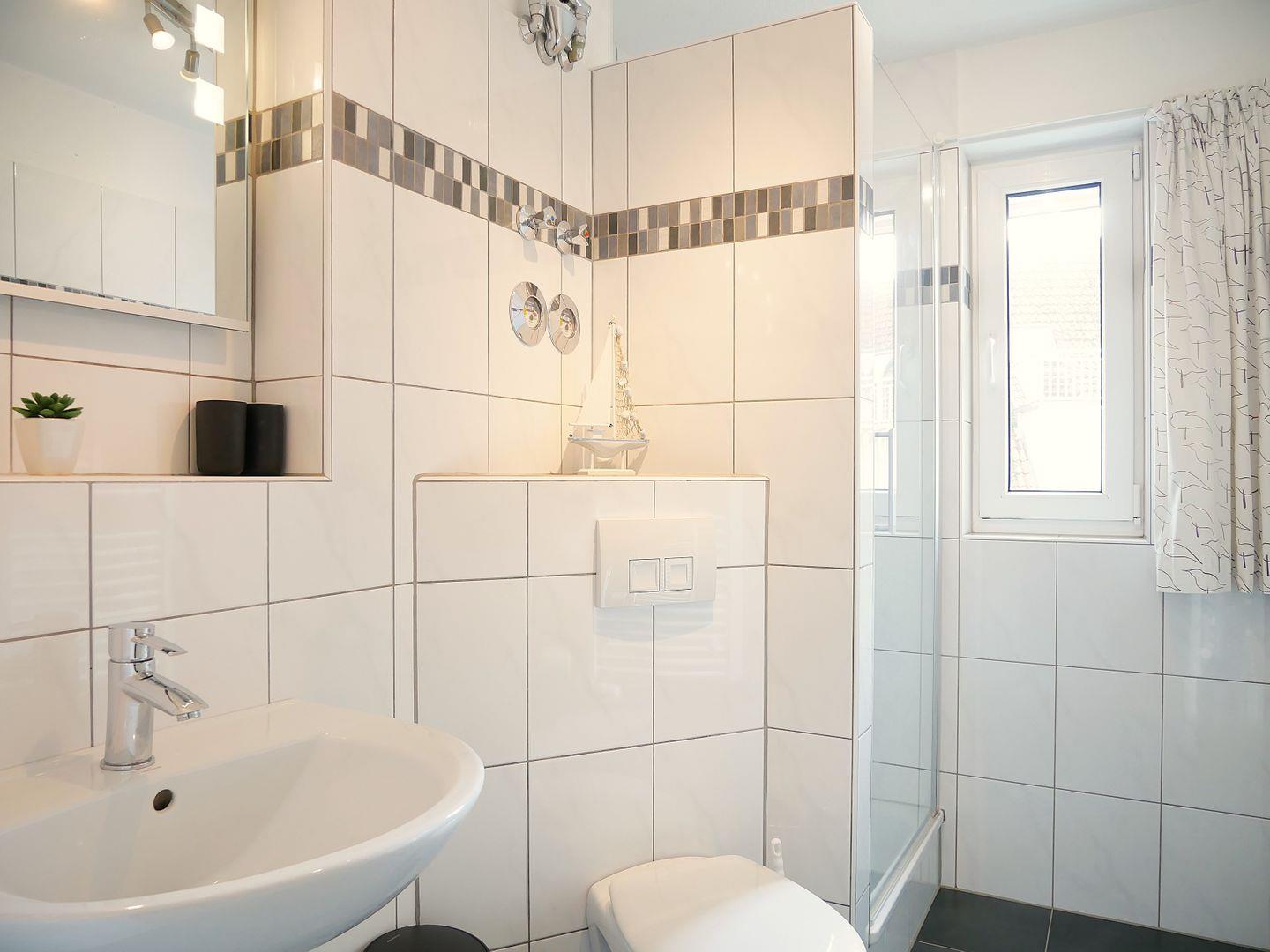 Das Tageslichtbadezimmer ist mit einer Dusche, einem Waschtisch, einem WC und Fön eingerichtet.