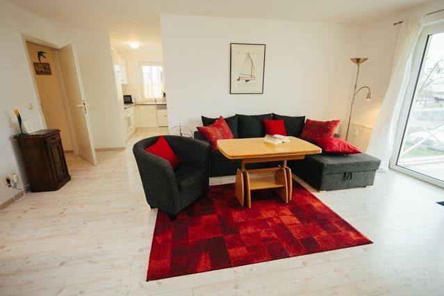 Wir bieten Ihnen eine modern eingerichtete, großzügige 3-Zimmer- Ferienwohnung mit Balkon. Dieser ist mit Holzfliesen und Balkonmöbeln ausgestattet und lädt zu entspannten Stunden ein. Die Fußböden der Wohnung sind mit hellem, wohnlichen Laminat bzw. hellen Fliesen verlegt und sorgen für Wohlfühlatmosphäre.