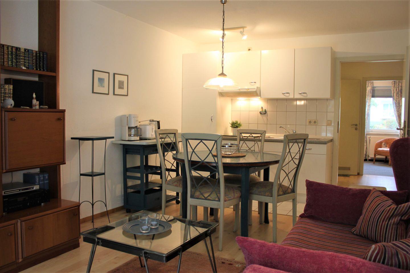 Diese Zwei-Zimmer-Ferienwohnung liegt im Erdgeschoss des Mehrfamilienhauses und bietet bis zu 2 Personen auf ca. 40 qm Wohnfläche ausreichend Platz für einen schönen Urlaub.