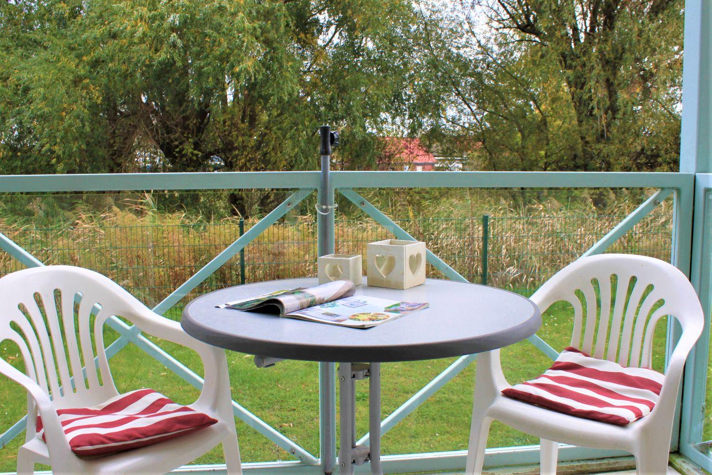 Das Wohnzimmer bietet ein komfortables Sofa mit TV-Gerät, einen Esstisch mit Stühlen und den Zugang zum möblierten,überdachten Balkon, von dem Sie einen schönen Blick auf die umliegende Natur und teilweise auf die Kirchsee mit Wismarbucht haben. In den Raum ist ebenfalls eine Küchenzeile integriert. Diese ist bspw. mit Herd mit Backofen, Kühlschrank mit Gefrierfach, Wasserkocher, Kaffeemaschine und Toaster ausgestattet.