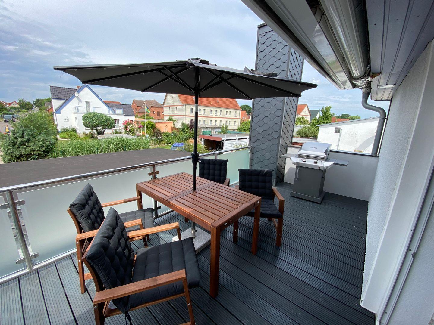 Bei schönem Wetter können Sie Ihre Mahlzeiten auch auf dem möblierten Balkon genießen. Hier verfügen Sie über einen Gasgrill, Sitzmöbel und einen Sonnenschirm. Der Zugang befindet sich im Essbereich.