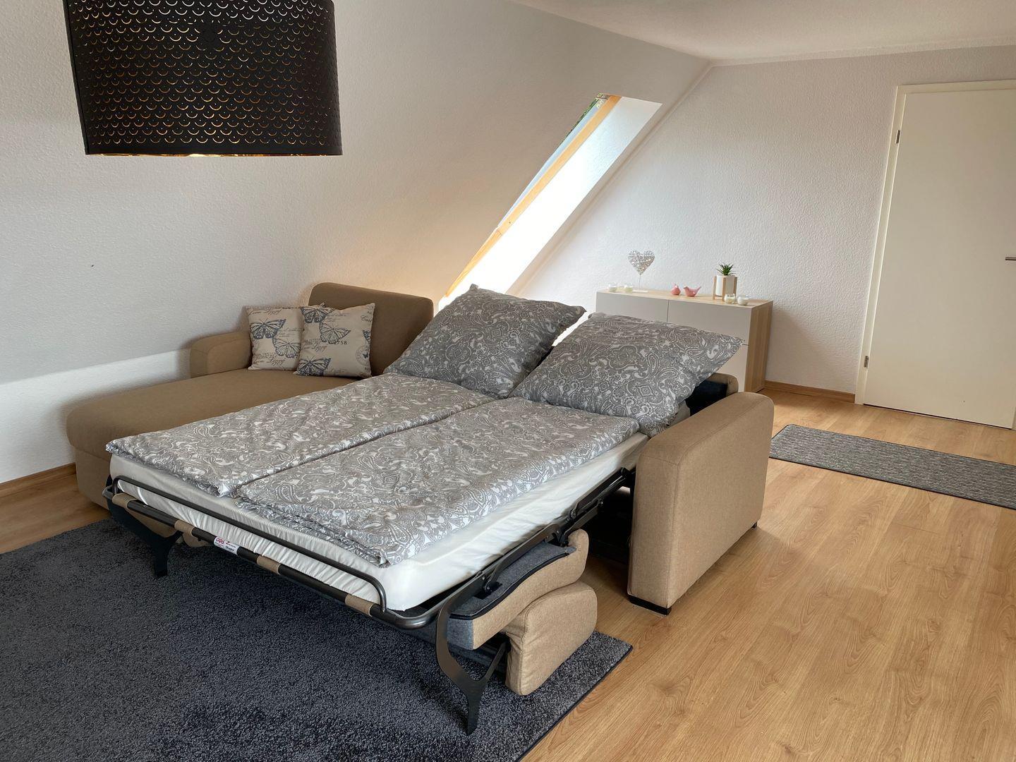 Diese stilvoll eingerichtete Ferienwohnung bietet bis zu 3 Gästen viel Platz und Komfort für einen erholsamen Urlaub. Der helle und großzügige Wohnbereich bietet Ihnen ein gemütliches Sofa, einen Smart-TV mit freiem Zugang zu Netflix und Disney+, Wlan, eine behagliche Sitzecke zum Lesen und einen Dachbalkon. Das Sofa kann bei Bedarf zu einer Schlafmöglichkeit für 2 Personen umgewandelt werden.