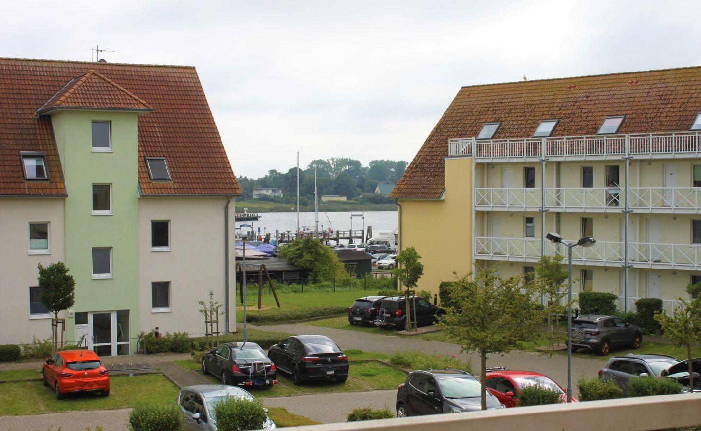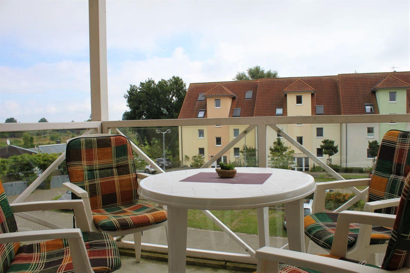 Vom möblierten Balkon aus, haben Sie einen eingeschränkten Blick auf den Hafen und Ostsee und können entspannte Stunden verbringen.