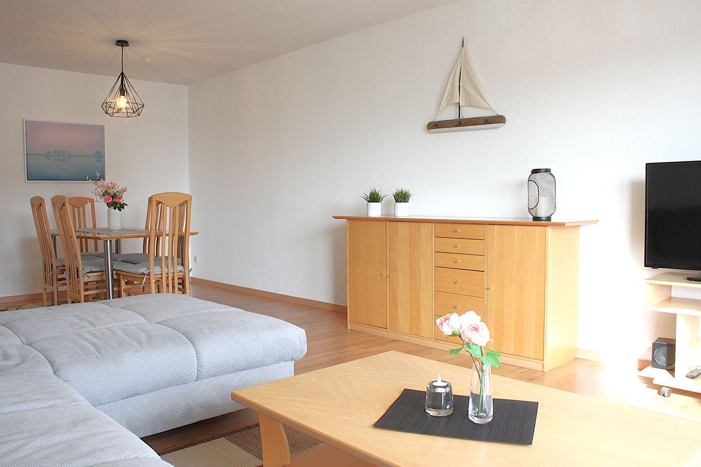 Der helle Wohnbereich ist mit einem Sofa, TV-Gerät und Esstisch ausgestattet. Die Küche ist in den Raum integriert und verfügt über einen Kühlschrank mit Gefrierfach, Herd mit Backofen, Kaffeemaschine, Wasserkocher und weiteren Kleingeräten.