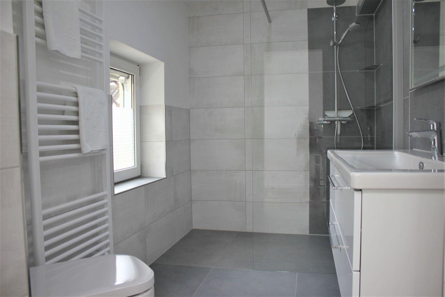 Das moderne Badezimmer verfügt über eine ebenerdige Dusche, einen großzügigen Waschtisch und ein WC.