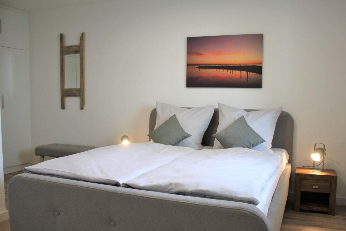 Das moderne Schlafzimmer ist separat und mit einem Polsterbett (160x200cm) und einem Kleiderschrank für Ihre Garderobe möbliert. Eine weitere Person findet auf dem Schlafsofa im Wohnzimmer einen komfortablen Schlafplatz.