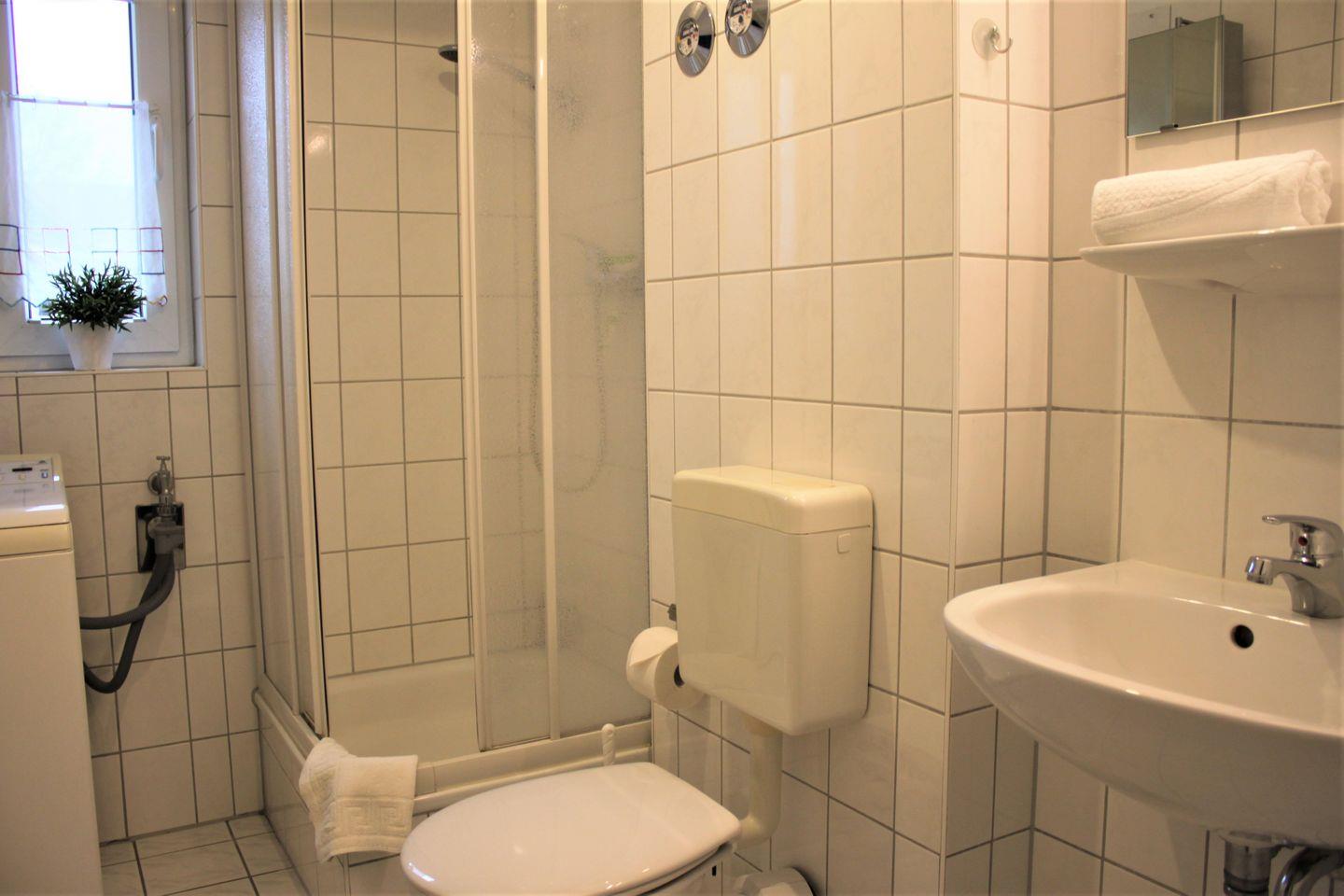 Im Badezimmer mit Tageslicht verfügen Sie über eine Dusche, Waschtisch, WC und Waschmaschine.