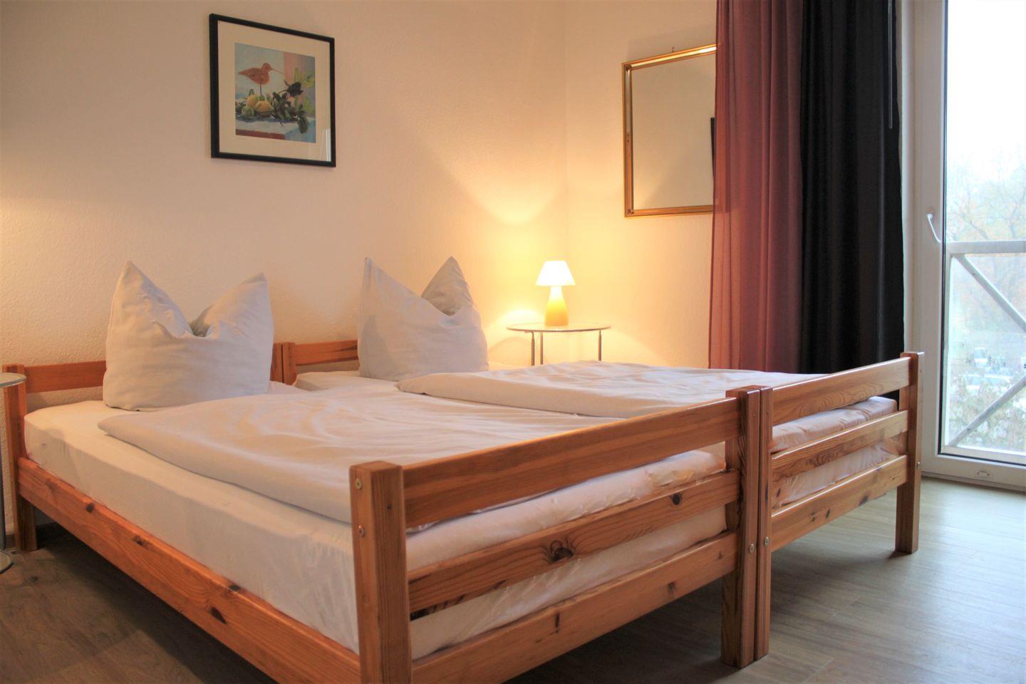 Das Schlafzimmer ist separat und mit einem Doppelbett (zwei zusammengeschobene Einzelbetten) und Stauraum für die Garderobe möbliert.