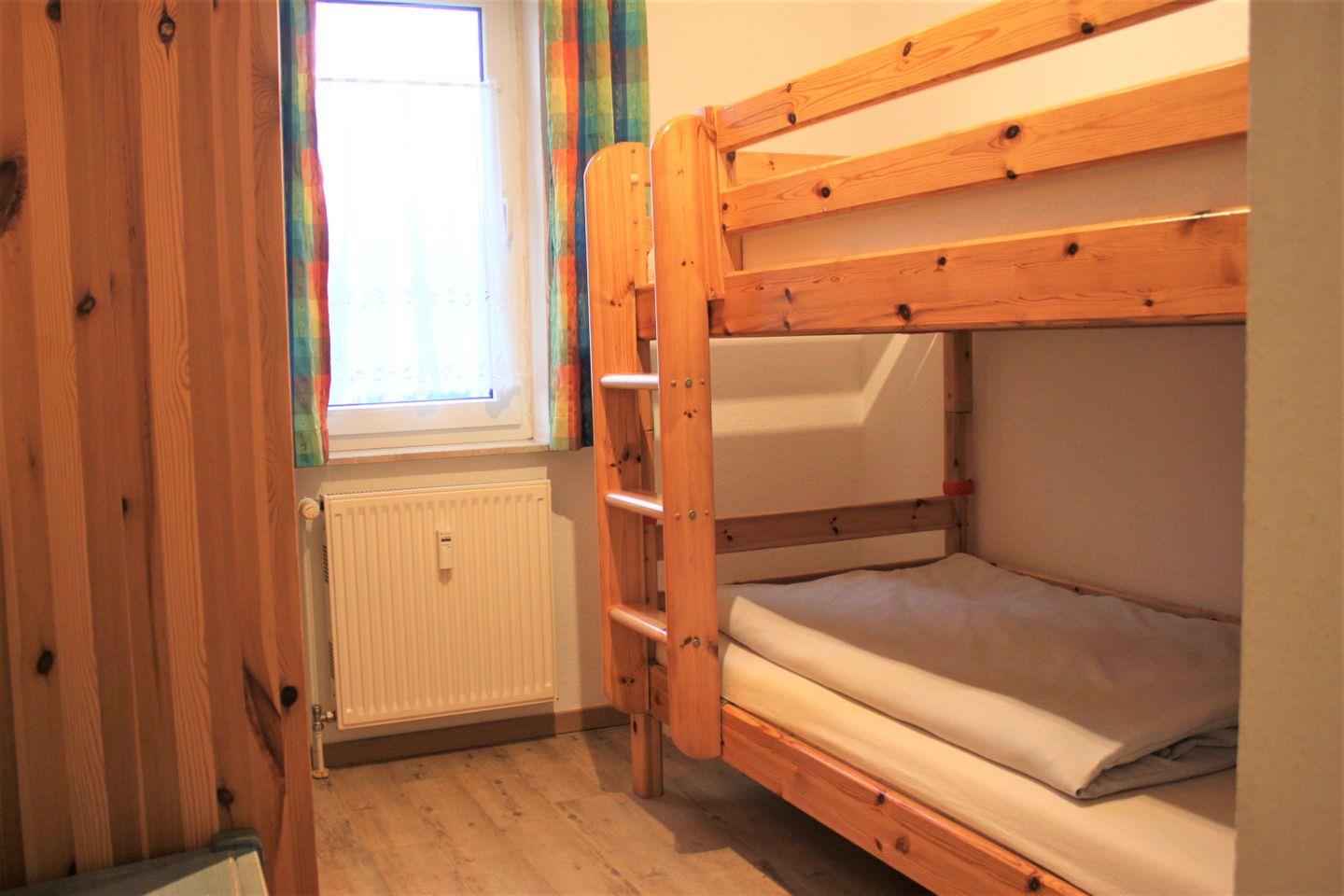 Die zwei separaten Schlafzimmer sind entweder mit einem komfortablen Doppelbett und Kleiderschrank oder einem Etagenbett und Kleiderschrank möbliert und ermöglichen erholsame Nächte.