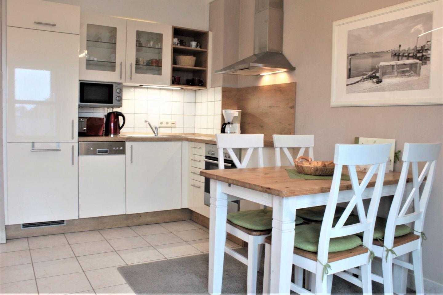 Die moderne Küche ist ebenfalls in den Raum integriert und gut ausgestattet. Dazu gehören z.B. ein Herd mit Backofen, Kühlschrank mit Gefrierfach, Geschirrspülmaschine und diverse Kleingeräte wie Kaffeemaschine, Wasserkocher und Toaster.