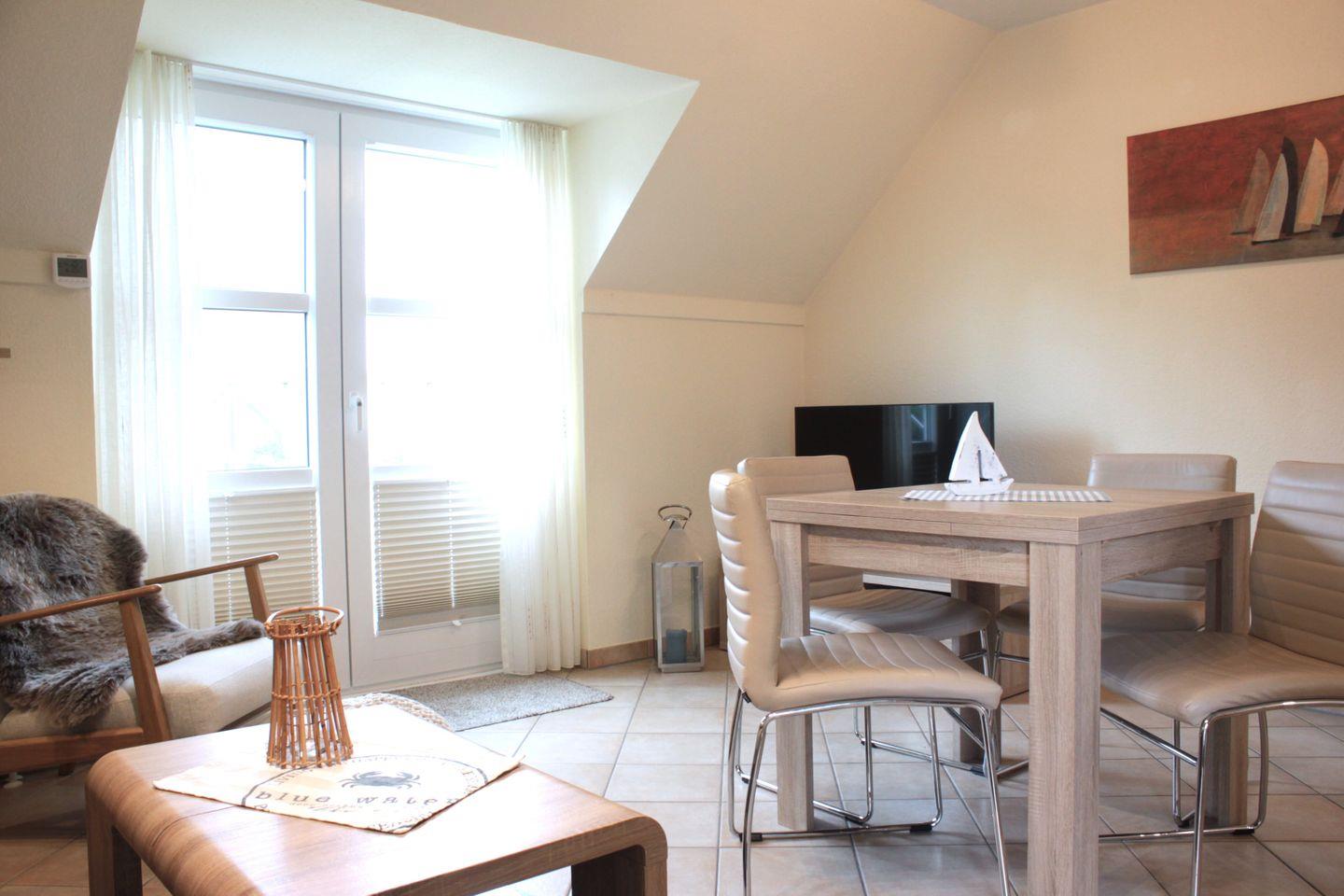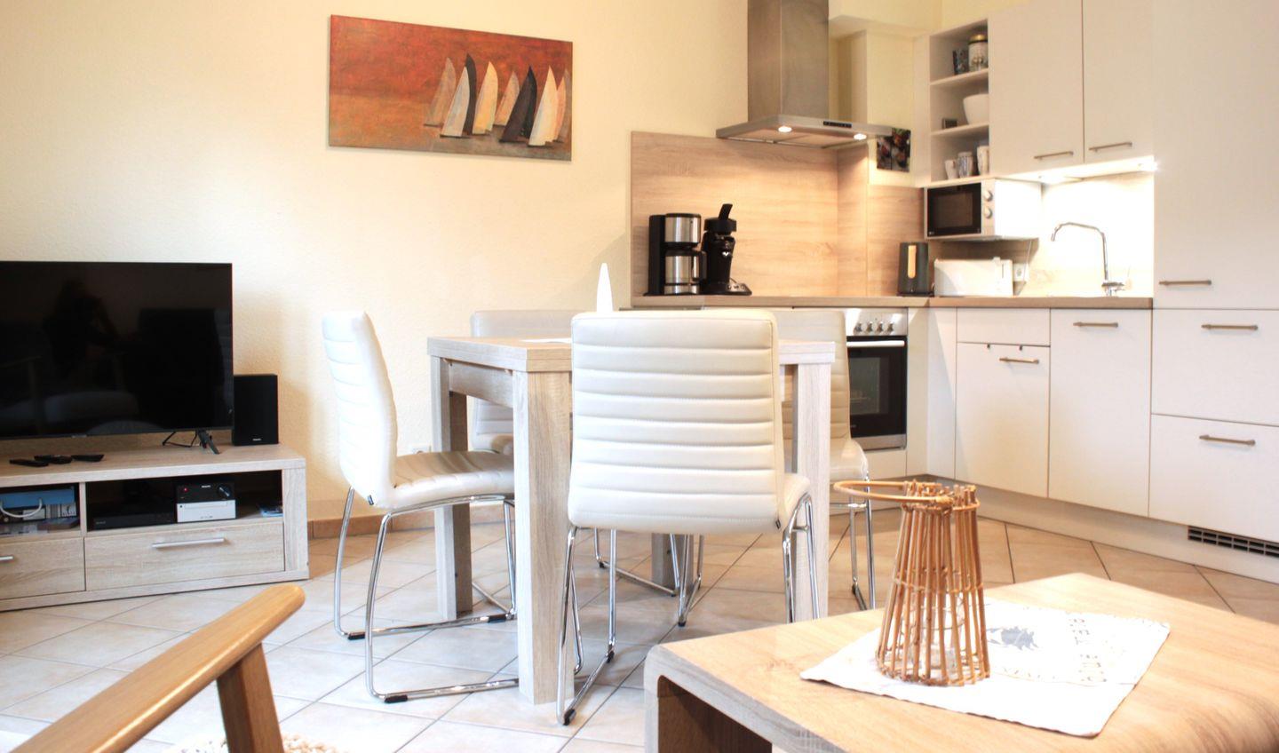 Im geräumigen Wohnzimmer finden Sie einen Esstisch, den Smart-TV, das gemütliche Sofa, welches zum Schlafsofa (Liegefläche 160x200 cm) für eine Person umfunktioniert werden kann und den Zugang zum möblierten Balkon. Außerdem verfügen Sie hier über die integrierte, gut ausgestattete Küche.