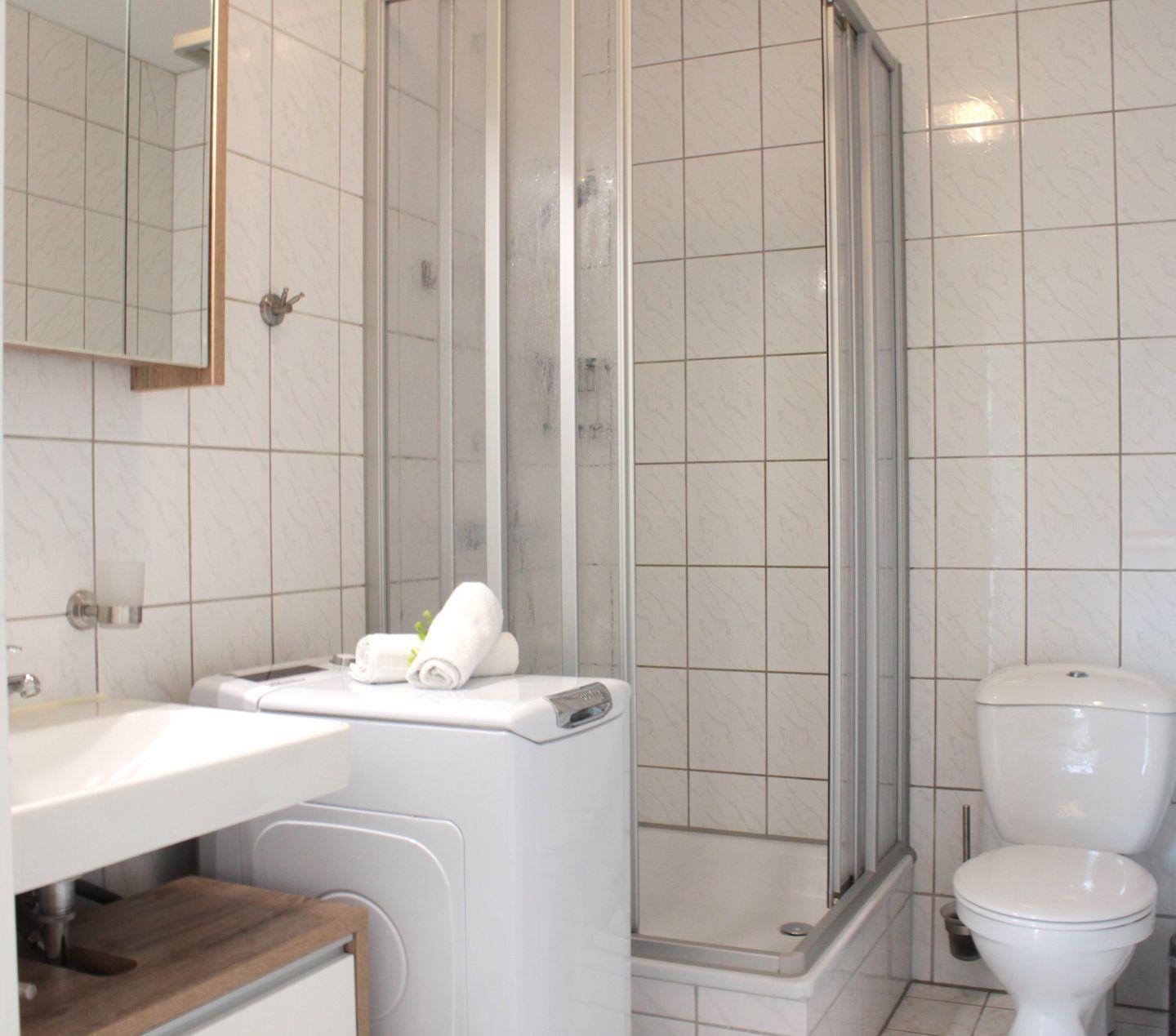 Das Badezimmer ist mit einer Dusche, Waschtisch, Waschmaschine und WC ausgestattet.