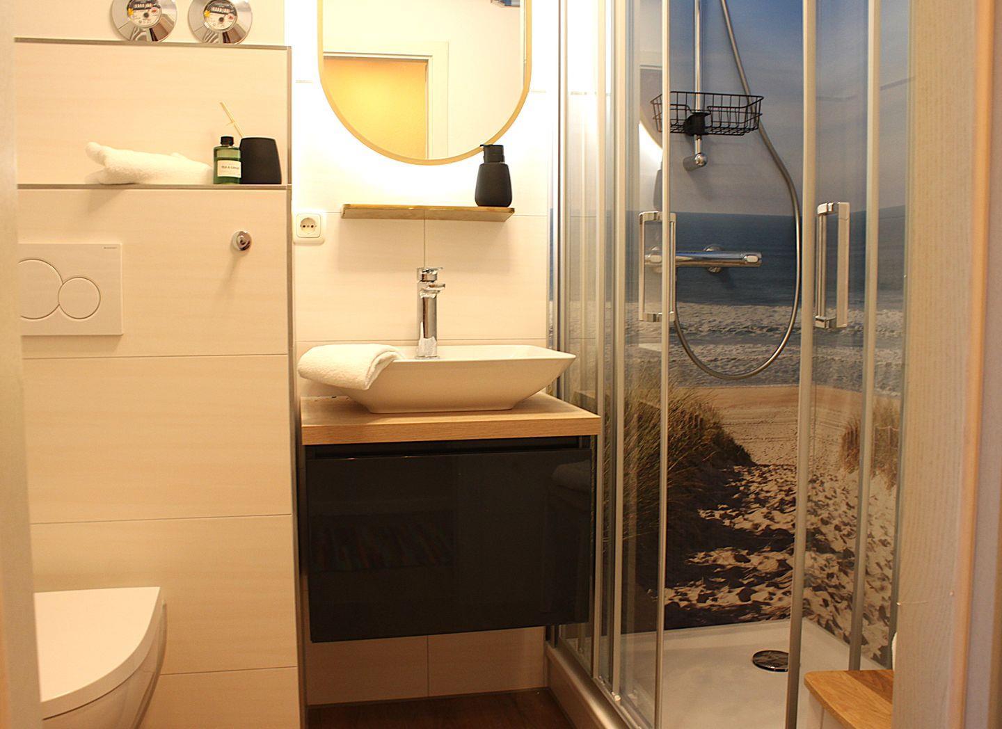Das Badezimmer bietet Ihnen eine Dusche, Waschbecken und WC.