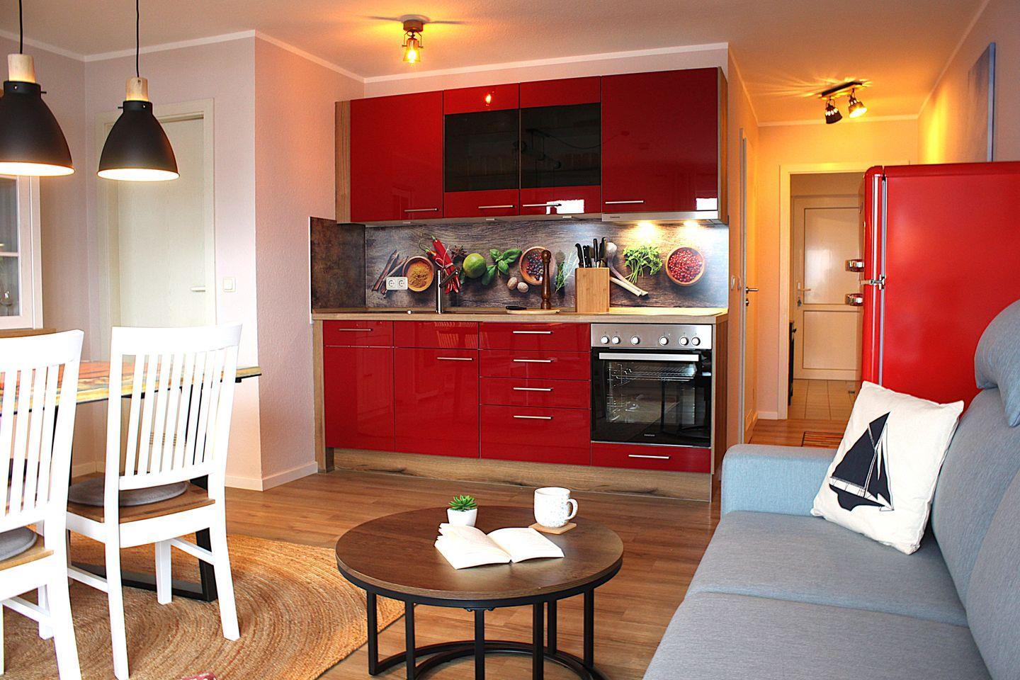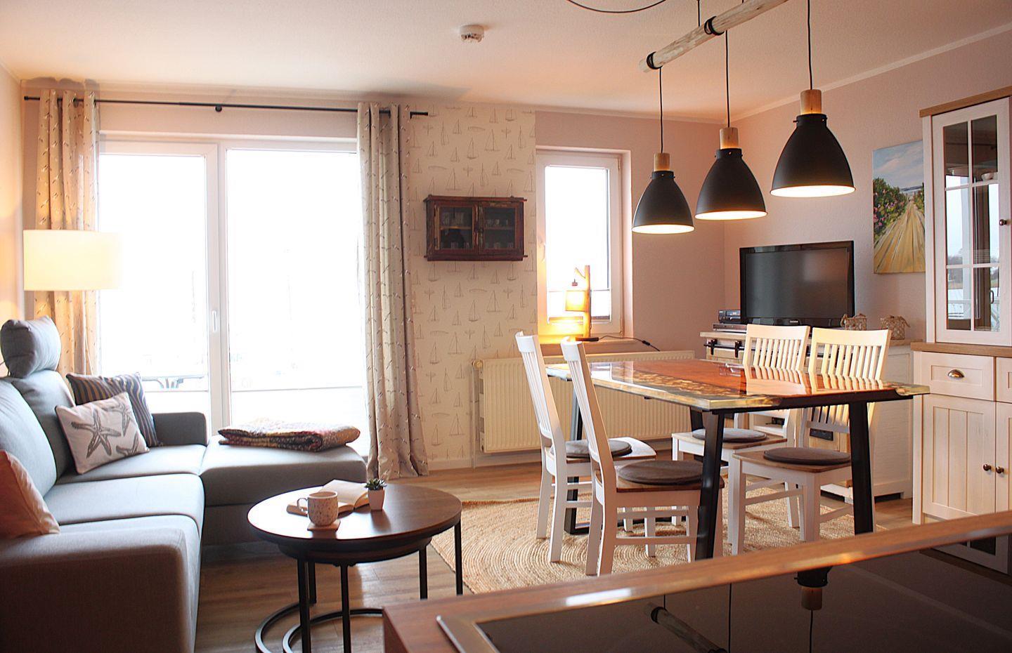 Der kombiniert eingerichtete Wohn- und Essbereich verfügt über eine Couch, einen TV, einen großzügigen Esstisch und eine integrierte Küchenzeile. Diese ist sehr gut ausgestattete und ermöglicht Ihnen eine entspannte Selbstversorgung. Im Wohnbereich finden Sie außerdem den Zugang zum möblierten Balkon mit uneingeschränktem Blick auf die Wismarbucht.