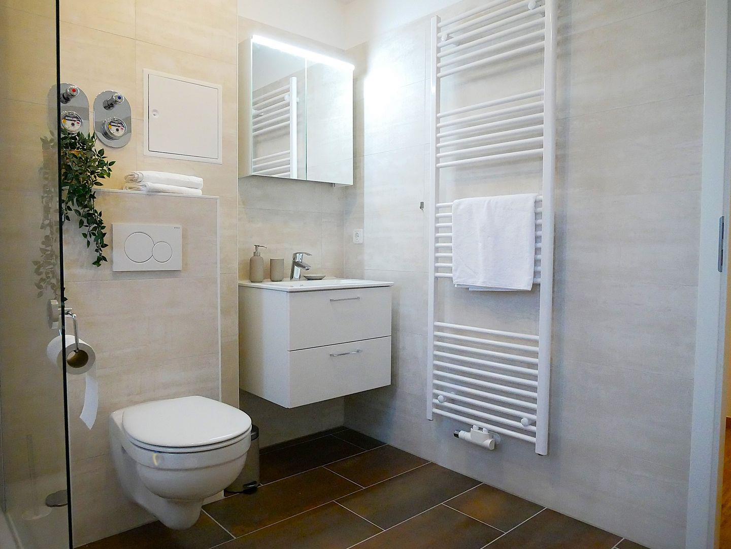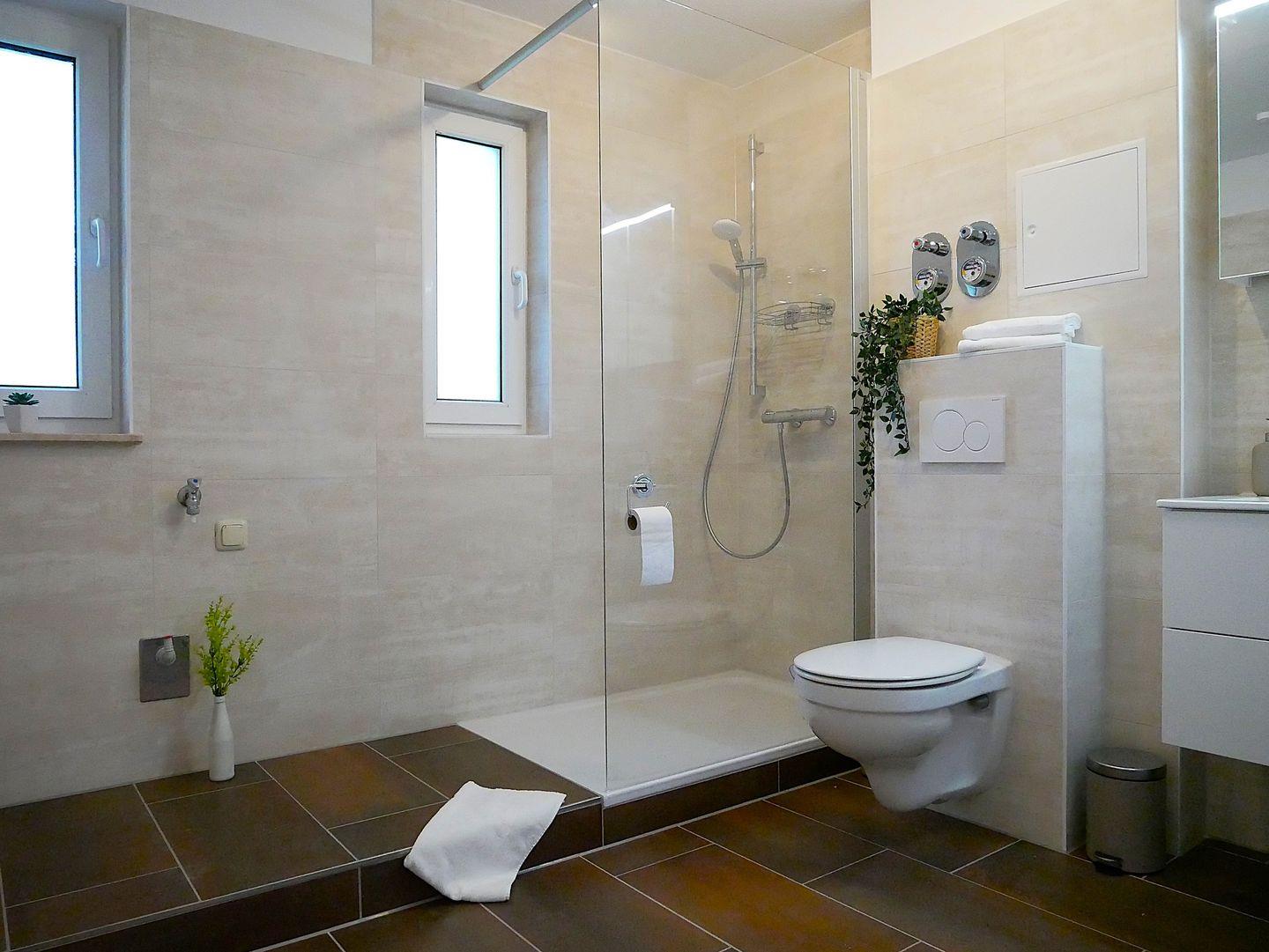 Das Badezimmer ist mit einer großen ebenerdigen Dusche, einem Waschtisch, WC und Handtuchhalter ausgestattet.