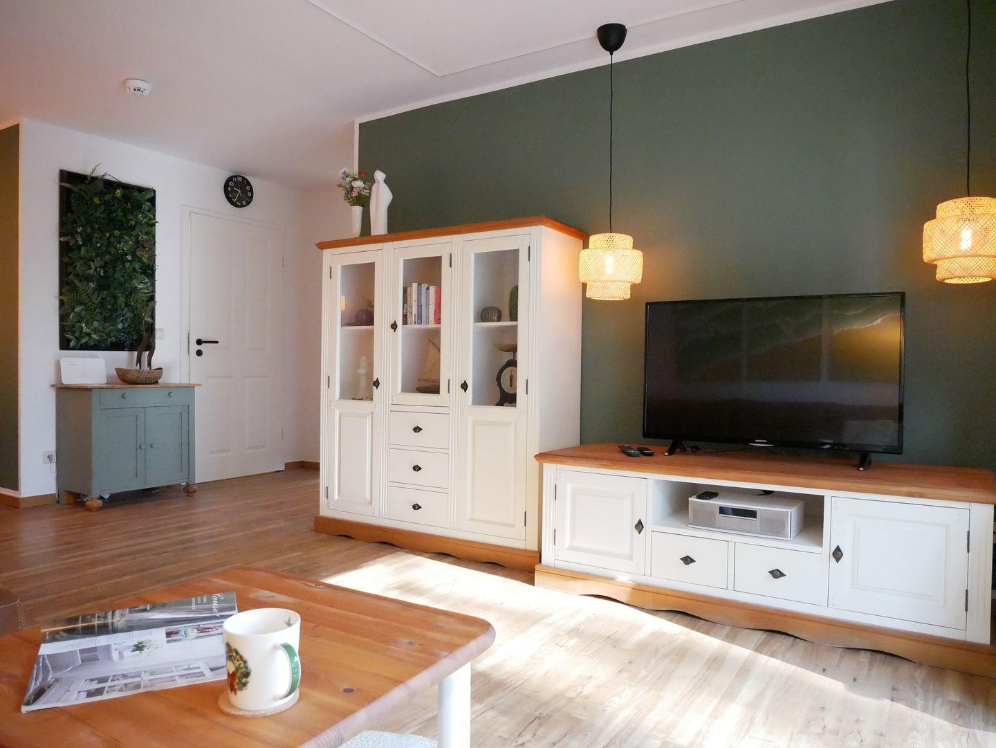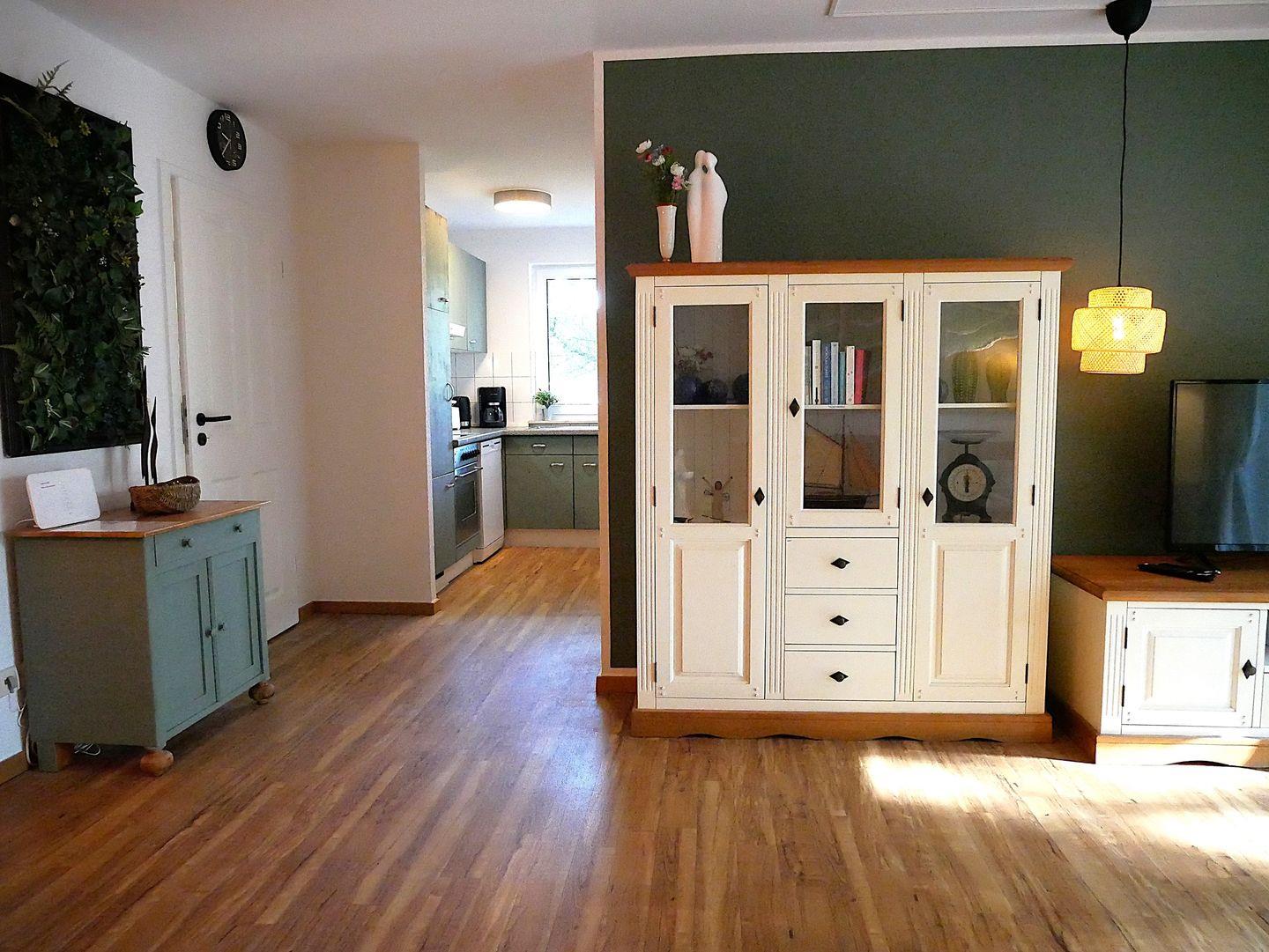 Das kombinierte Wohn- und Esszimmer ist großzügig mit einer Sofaecke, TV-Gerät, WLAN und Essbereich ausgestattet und lädt zum Verweilen und Erholen ein. Die kleine Küche bietet Ihnen viele Annehmlichkeiten und eine gute Ausstattung zur entspannten Selbstversorgung.