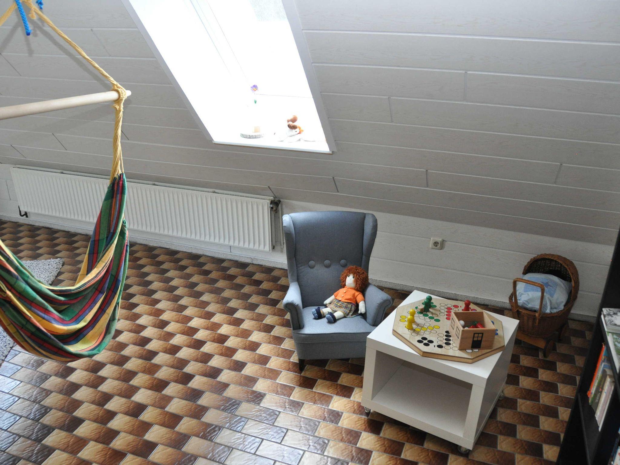 • Wohnzimmer mit Fernseher, Sessel und Schlafcouch für 2 Personen (Liegefläche 1,40 m x 2,00 m), Spielecke, Hängesessel, Kindersessel