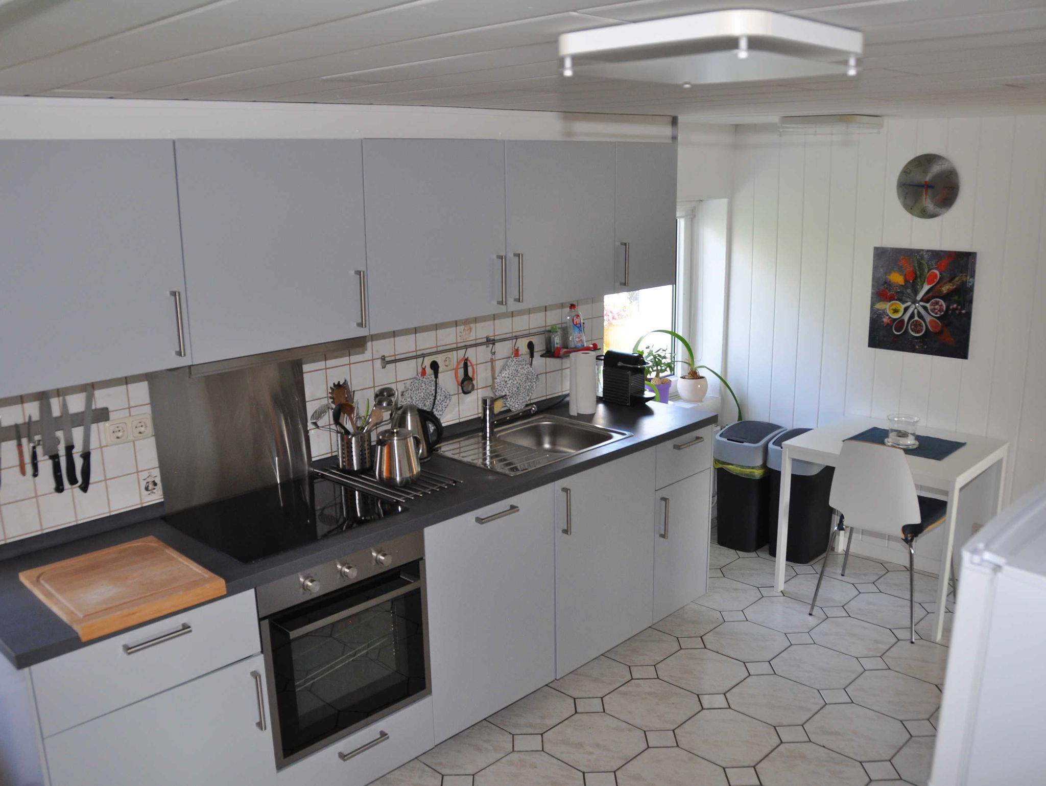• Küche: vierflammiger Induktionsherd mit Backofen, Spülmaschine, Mikrowelle, Espresso-Kapselmaschine, Wasserkocher, Kühl/Gefrierschrank, kleiner Frühstückstisch mit 2 Stühlen