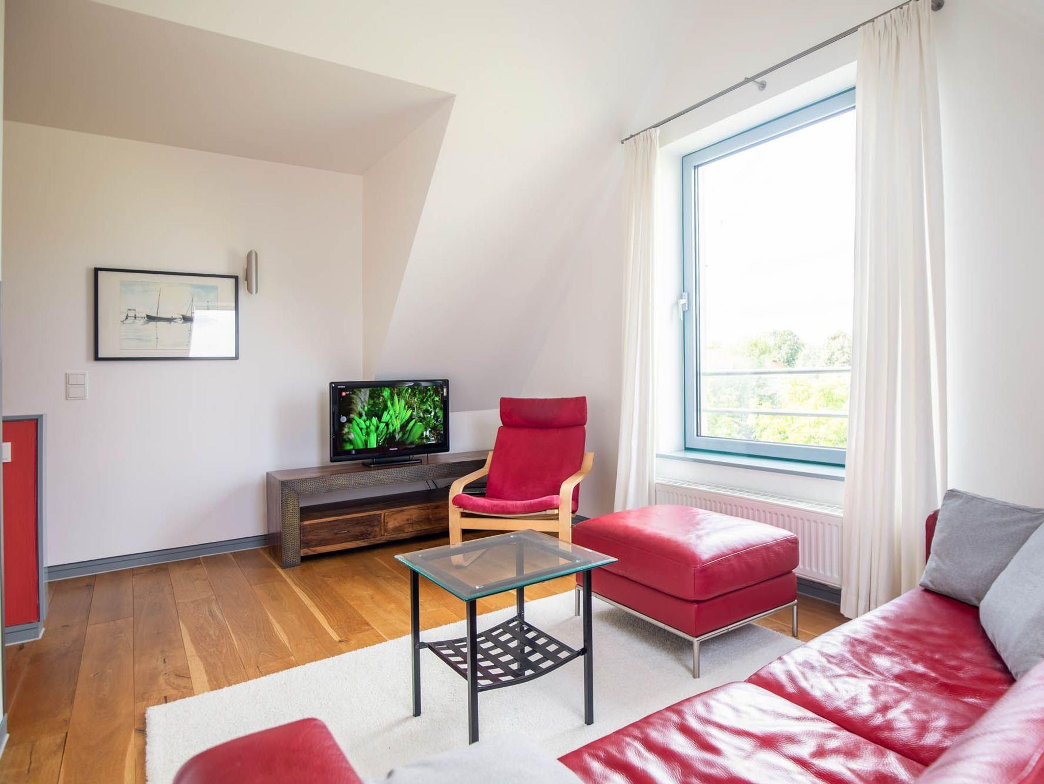 Hier begrüßt Sie ein offener Bereich mit Sofa sowie ein 2. TV-Gerät. In einer separaten Ecke können Sie in Ruhe an dem Schreibtisch schreiben, zeichnen, Arbeiten erledigen.