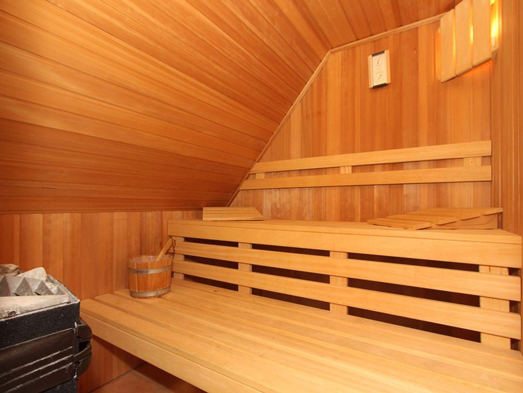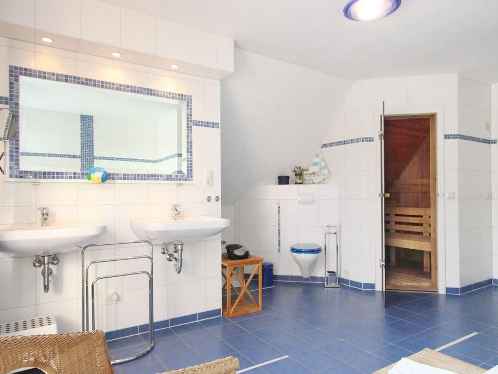 Im Badezimmer gibt es 2 Waschbecken, Dusche, WC, Badewanne und Sauna.