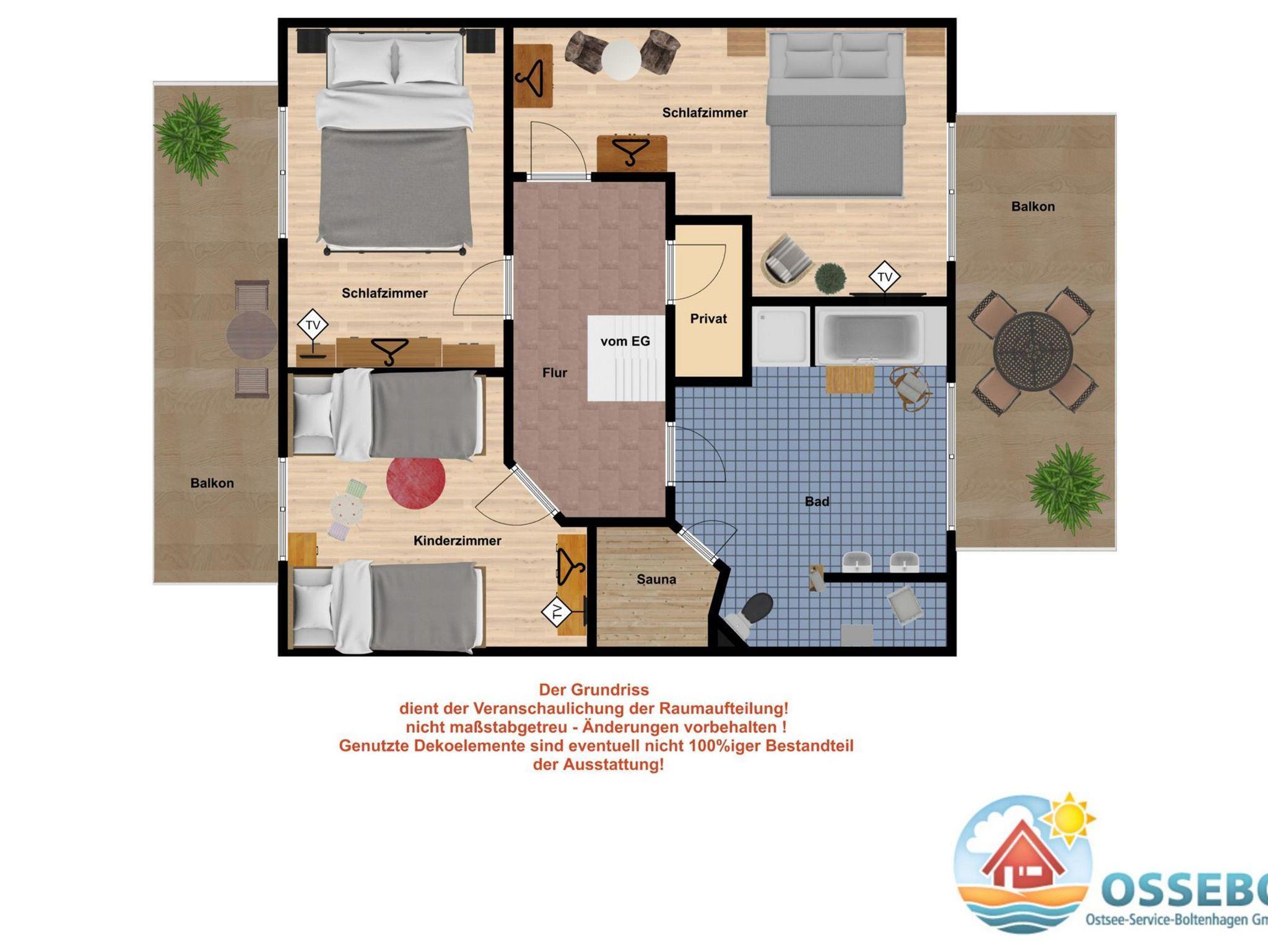 In der zweiten Wohnebene befinden sich die 3 Schlafzimmer: Für Kinder stehen im Kinderzimmer 2 Einzelbetten zur Verfügung. Im 2. und 3. Schlafzimmer steht jeweils ein Doppelbett. Im 3. Schlafzimmer ist zusätzlich ein Fernseher und ein Kinderreisebett.