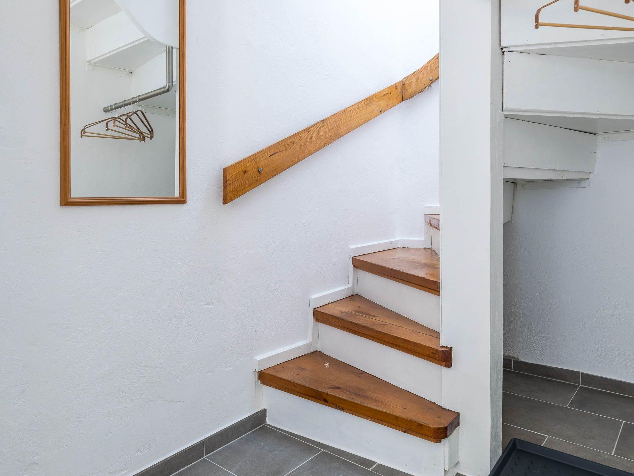 Eine Wendeltreppe führt ins Obergeschoss, in dem sich zentral ein großer Kleiderschrank befindet.
