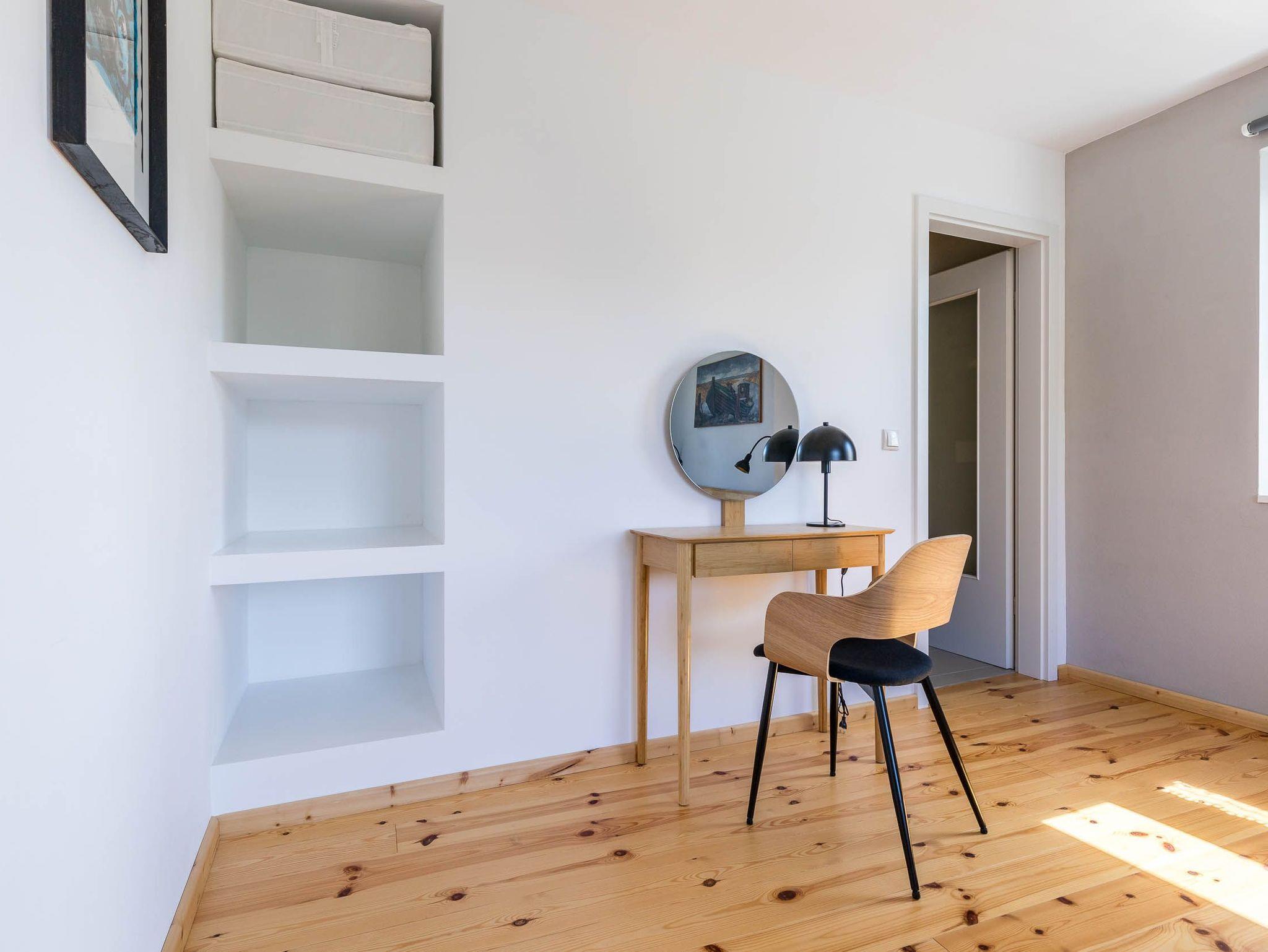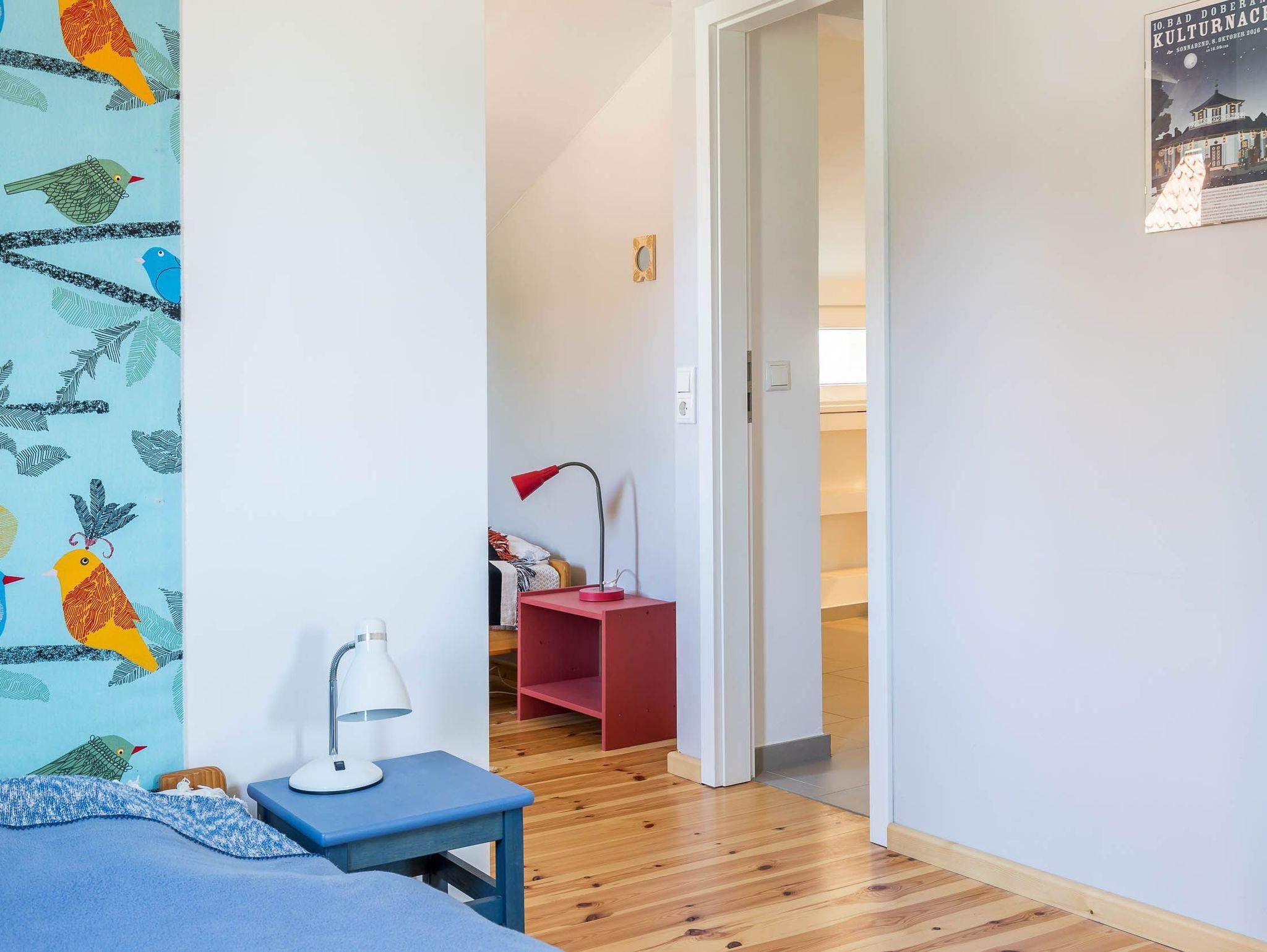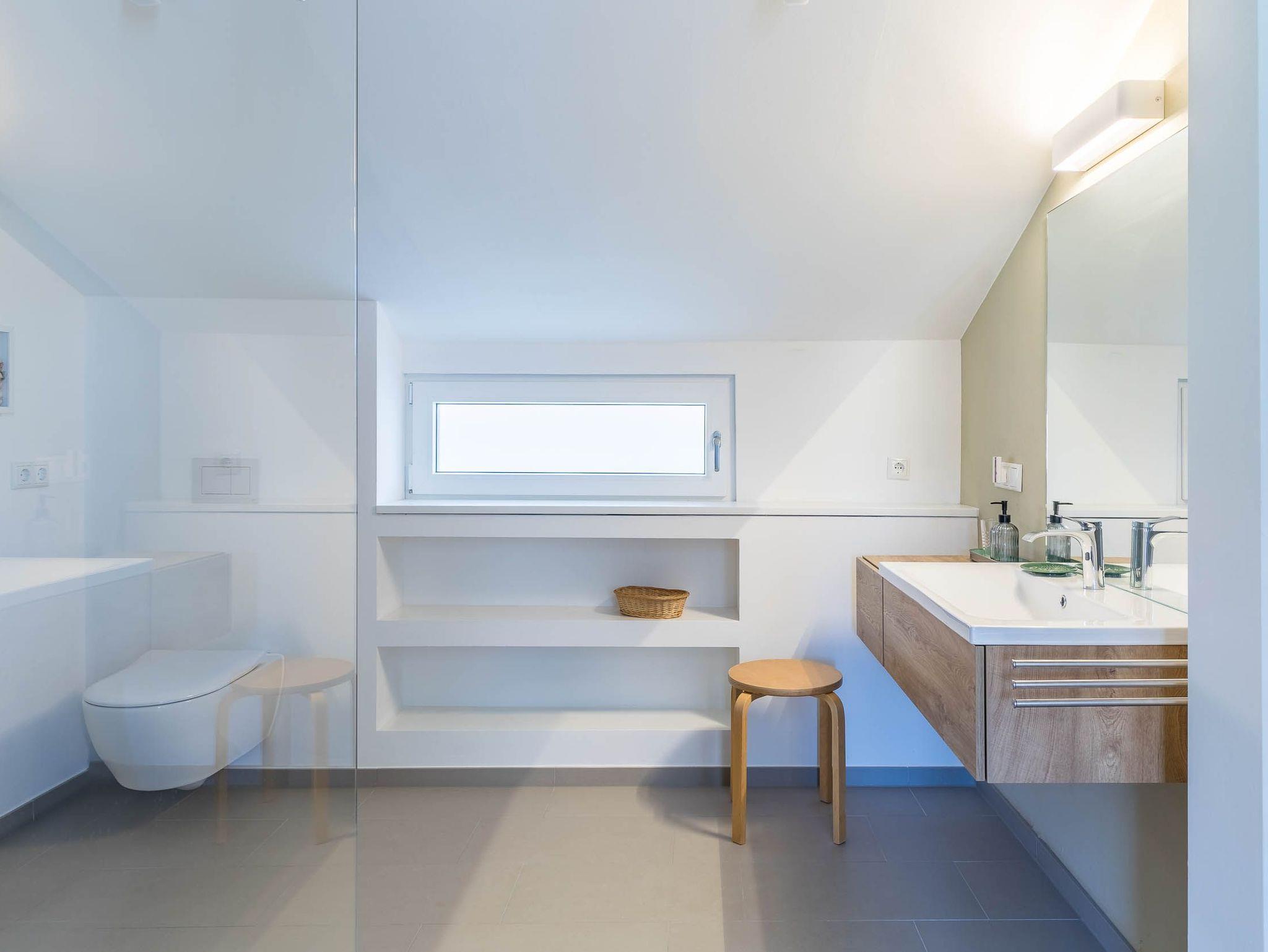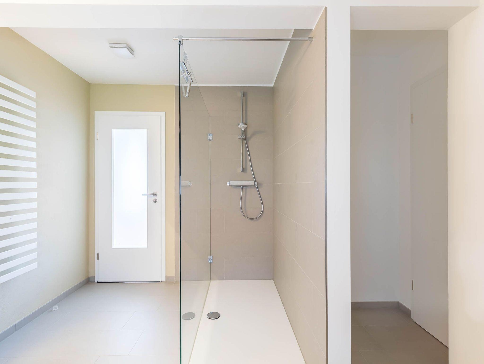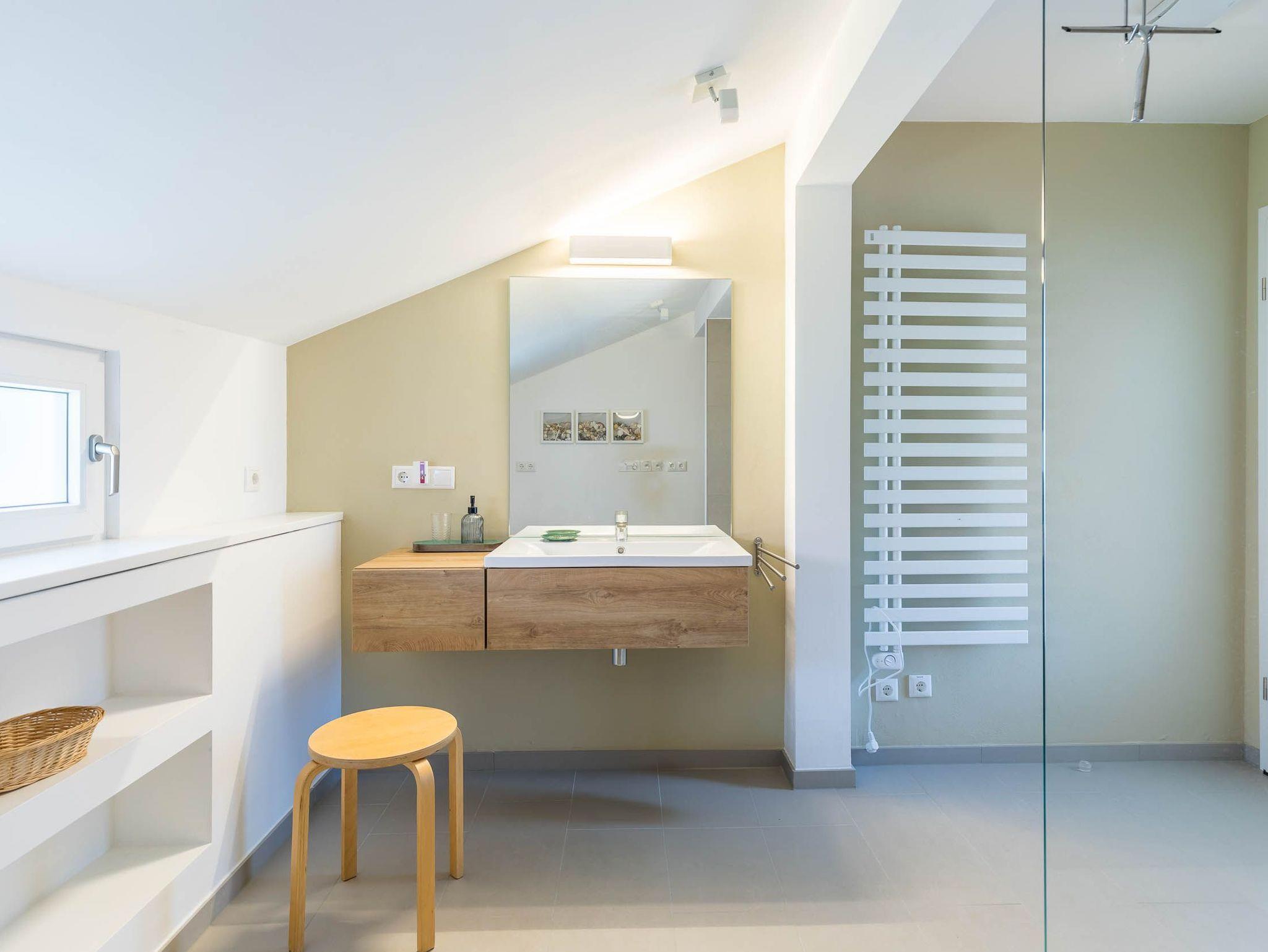 Der Schlafbereich ist in zwei Räume geteilt, die jeweils einen Zugang zu dem geräumigen, modernen Tageslicht-Bad haben. Das Bad ist mit WC, großer, ebenerdiger Dusche und reichlich Ablagemöglichkeiten ausgestattet.