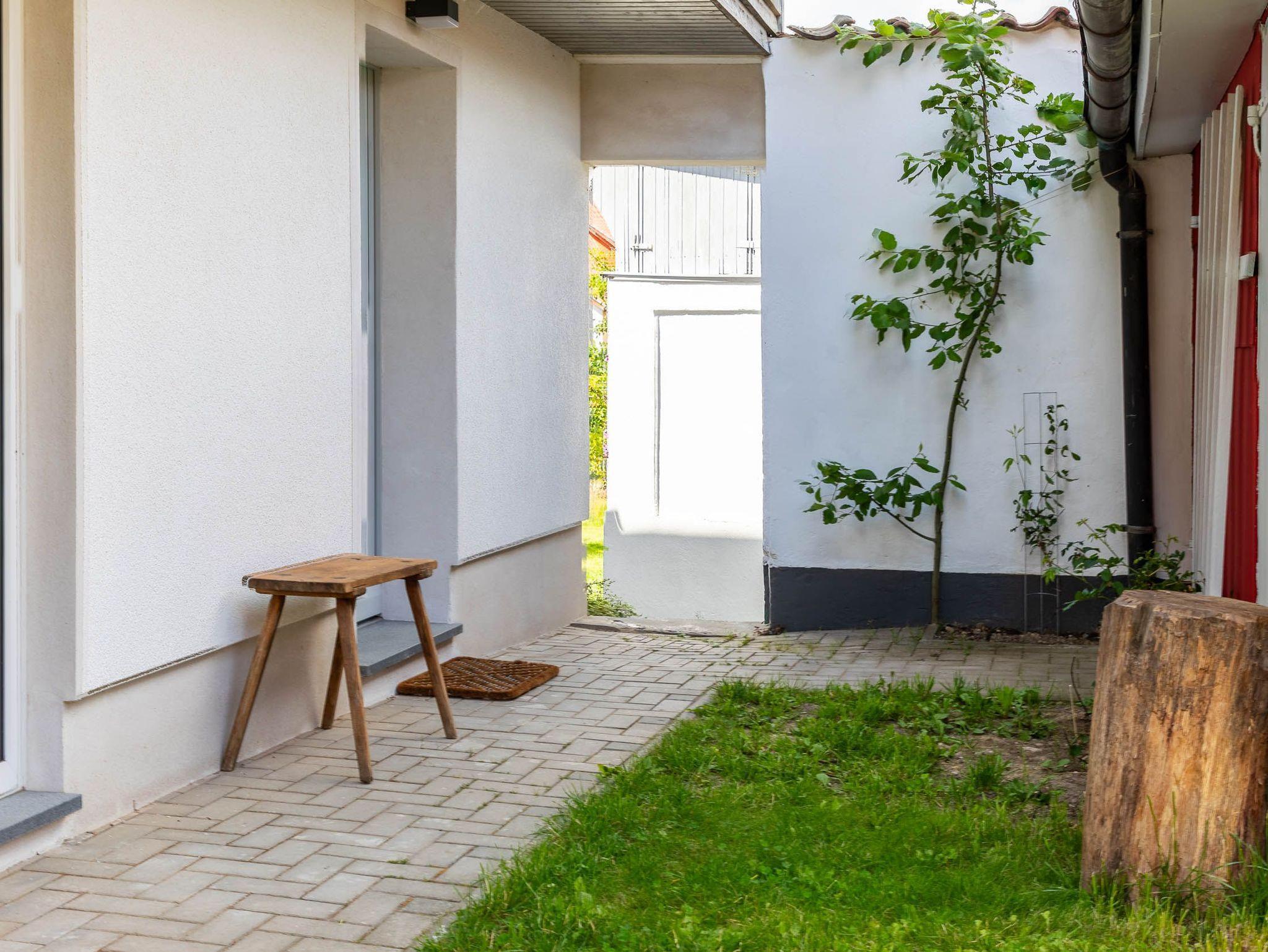 Ein Kamin sorgt für Gemütlichkeit, ein direkter Zugang führt auf eine kleine, überdachte Terrasse und in den großen Garten zur alleinigen Nutzung. Früchte, Kräuter und Blumen für den Eigenbedarf inklusive….