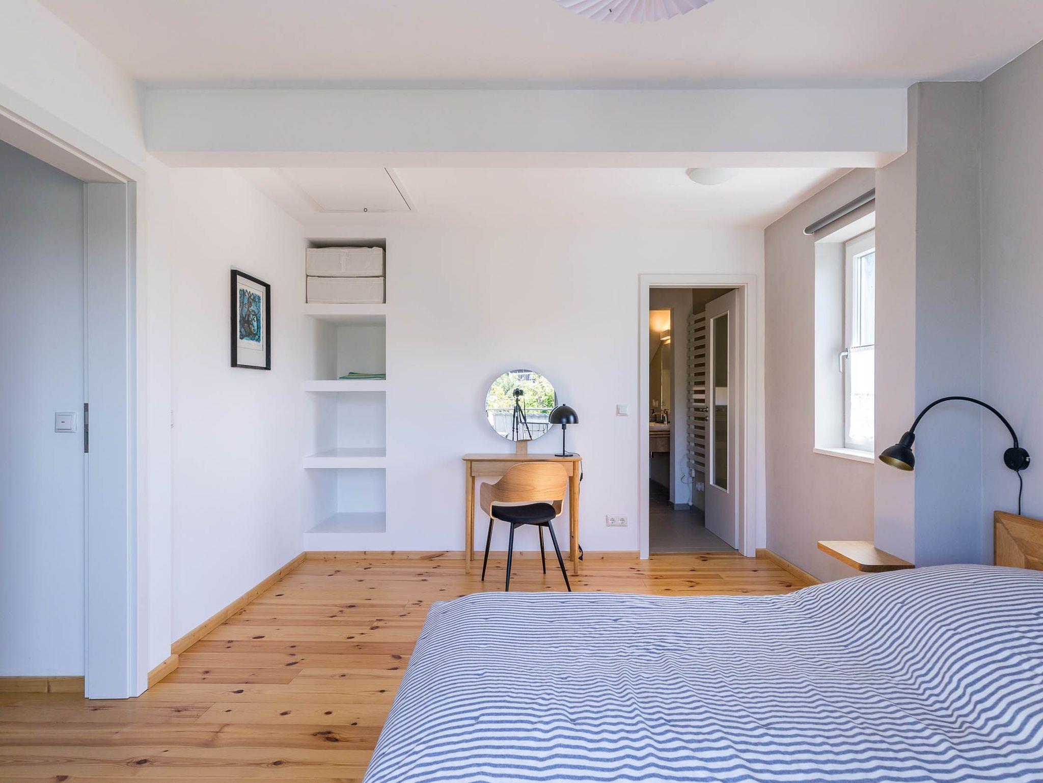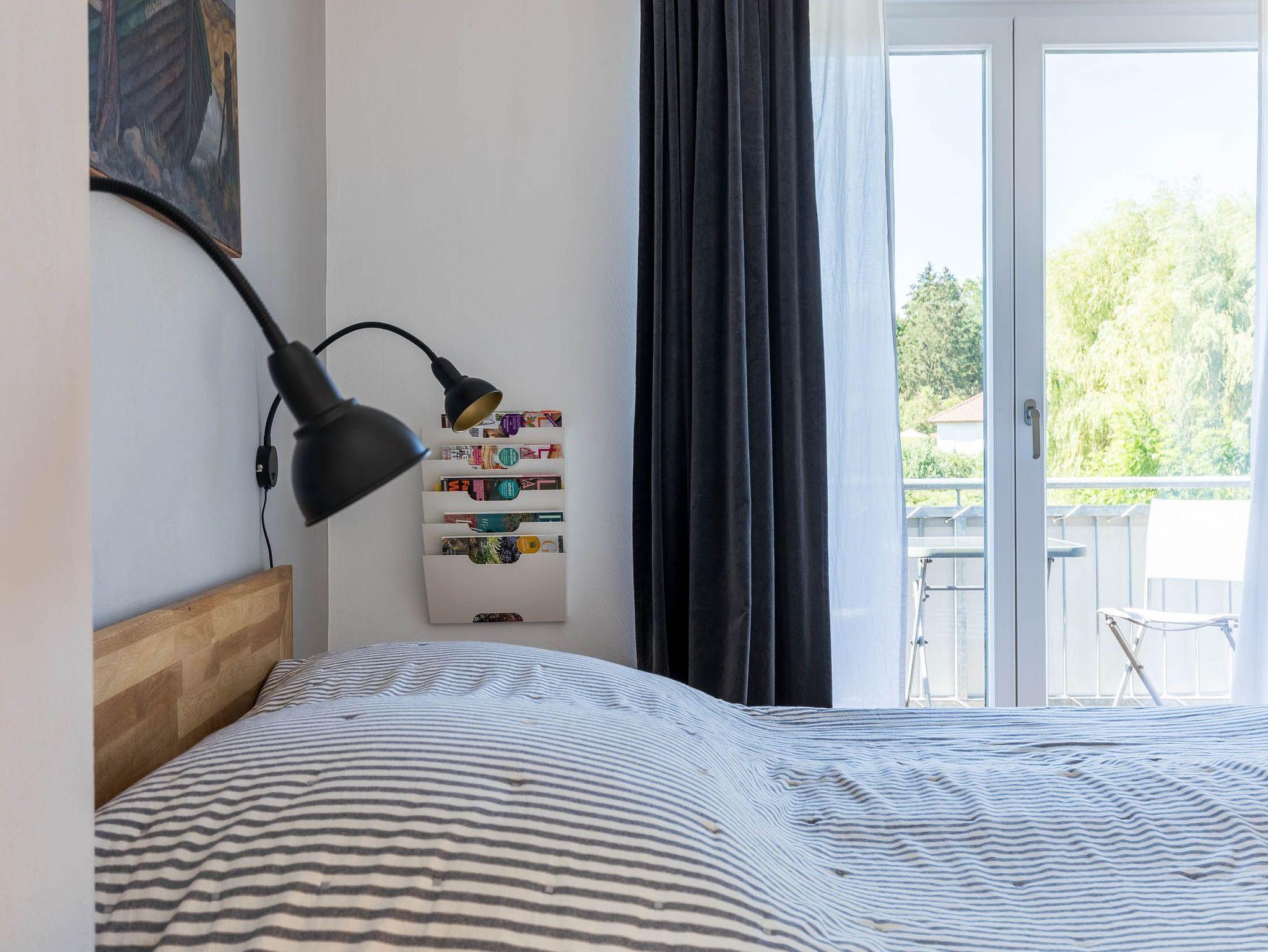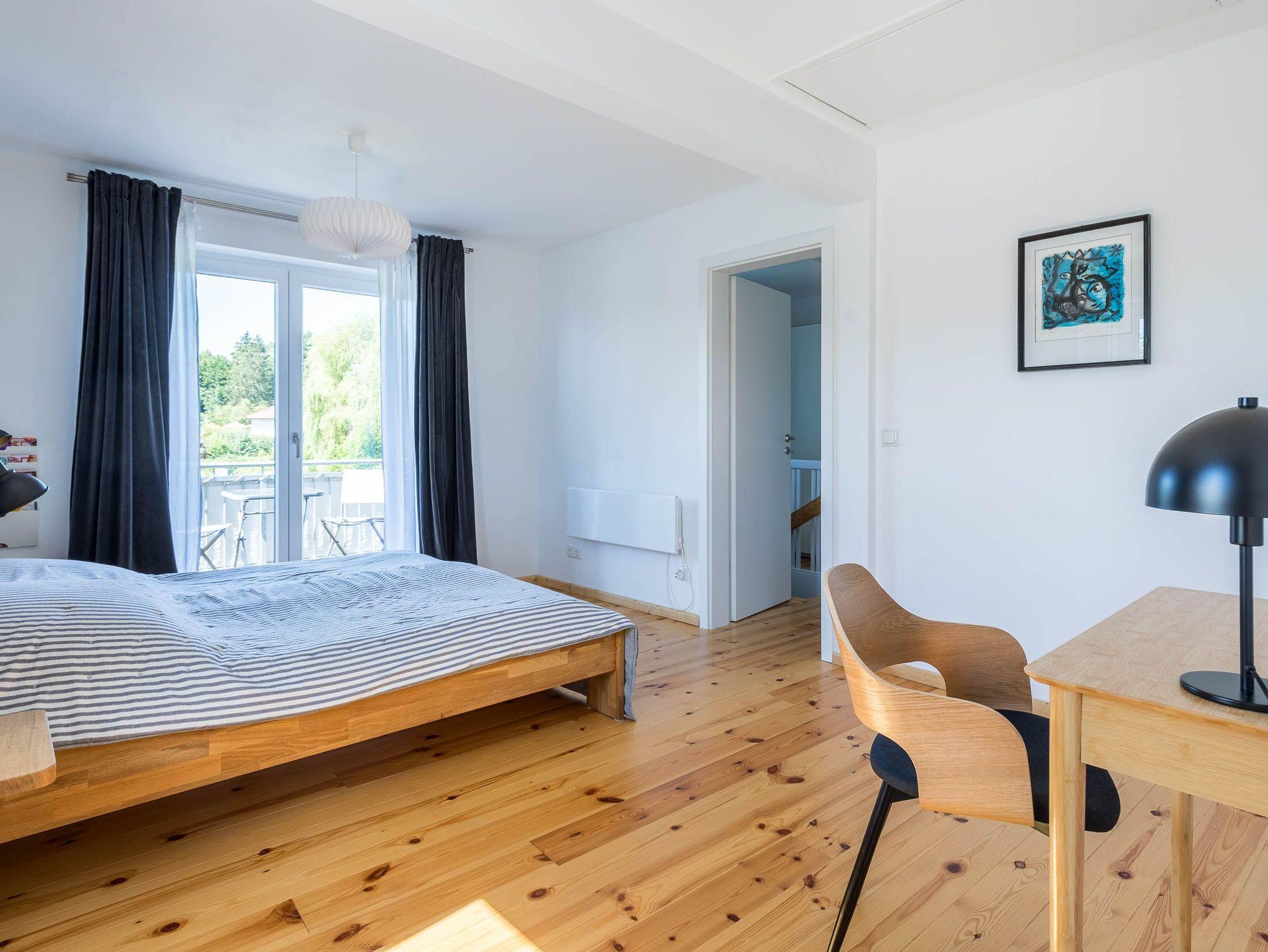 Das Hauptschlafzimmer (160 x 200 cm) bietet ein großes Einbauregal, einen kleinen Schreibtisch und einen Zugang zum großen Balkon (Südseite) mit weitem Blick ins Grüne.