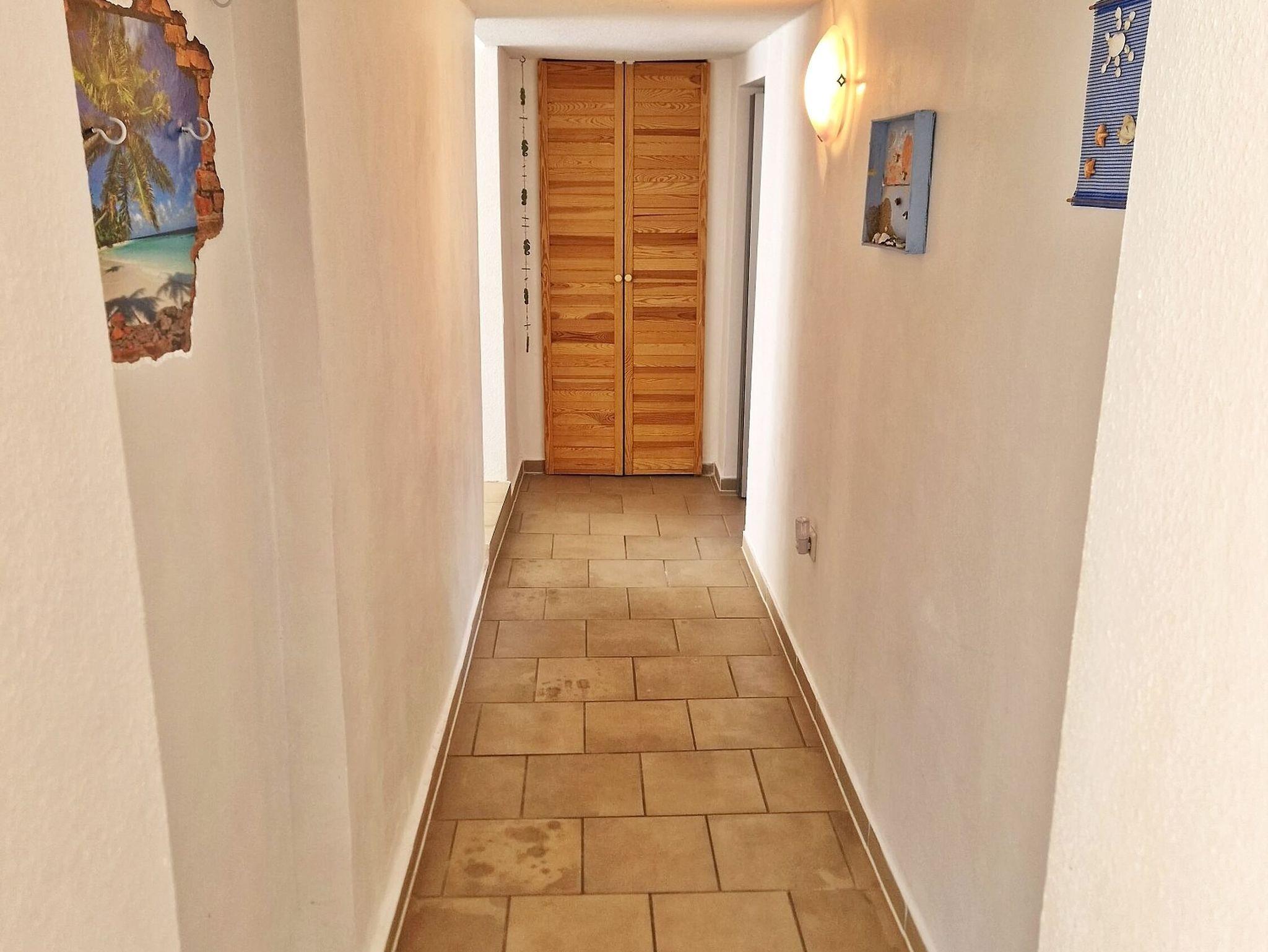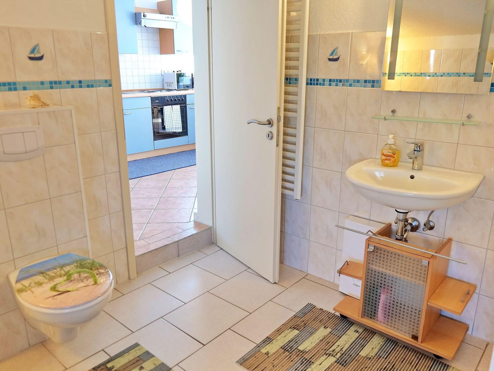 Zu den Räumlichkeiten gehört der helle und freundlich eingerichtete Wohnbereich (TV, Radio vorhanden) mit offener Küche, die u.a. mit Herd, Backofen, Mikrowelle, Kühlschrank, Wasserkocher, Toaster und Kaffeemaschine sowie dem Essplatz ausgestattet ist. In der Küche steht eine Grundausstattung mit den wichtigsten alltäglichen Dingen, wie Gewürze, Zucker und Salz etc. bereit. Weiterhin verfügt das Ferienhaus über 2 separate Schlafzimmer. Das eine der beiden Schlafzimmer ist mit einem Doppelbett ausgestattet. Das 2. separte Schlafzimmer verfügt über ein Doppelstockbett und außerdem über ein Einzelbett. Ein großzügiges Duschbad komplettiert die Räumlichkeiten des Ferienhauses.