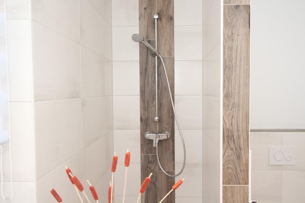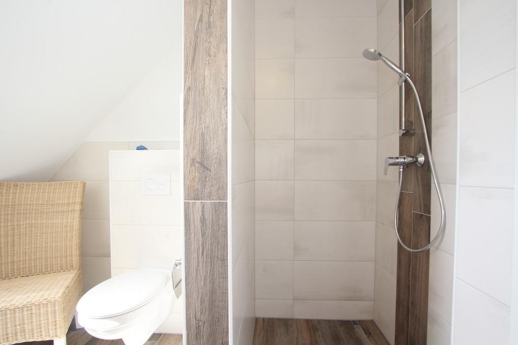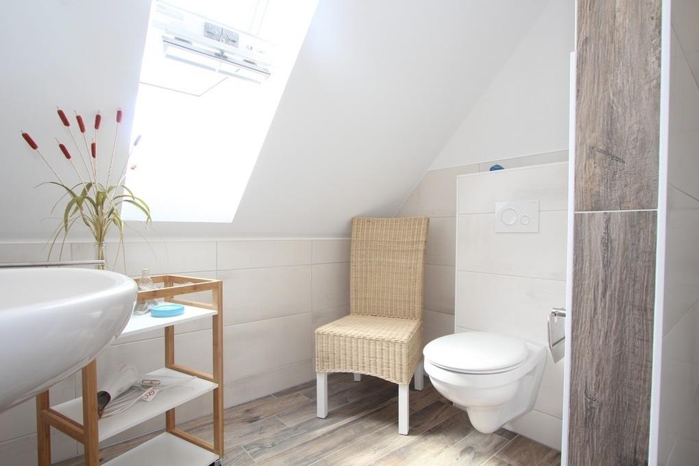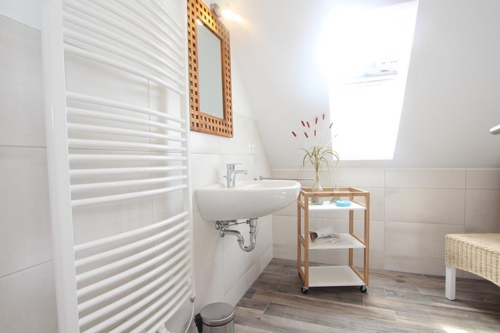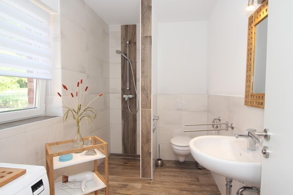 Ebenso befindet sich auf dieser Etage das erste der beiden modernen Bäder. Es bietet Tageslicht, eine bodengleiche Dusche und WC. Auch eine kostenlose Waschmaschine steht hier zur Nutzung bereit.