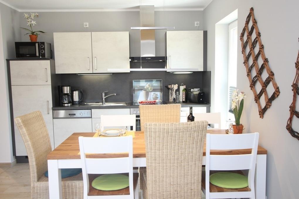 Bereiten Sie gern Ihre Mahlzeiten in der mit sämtlichen technischen Geräten modern ausgestatteten Wohnküche zu. An der separaten Essecke können Sie Ihre Köstlichkeiten anschließend bequem einnehmen oder gesellig beieinander sitzen.
