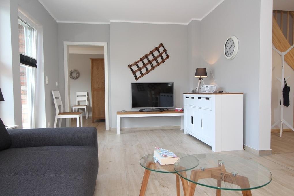 Im Erdgeschoss kann im Wohnbereich bei Bedarf das Sofa ausgezogen werden. Somit haben insgesamt bis zu 8 Gäste ausreichend Platz zum Wohlfühlen. Der kombinierte Wohn- und Essbereich besticht durch seine vielen Fenster und gibt dem Raum somit viel Licht. Der große Smart-Flatscreen-TV sorgt für Ihre Multimediaunterhaltung.