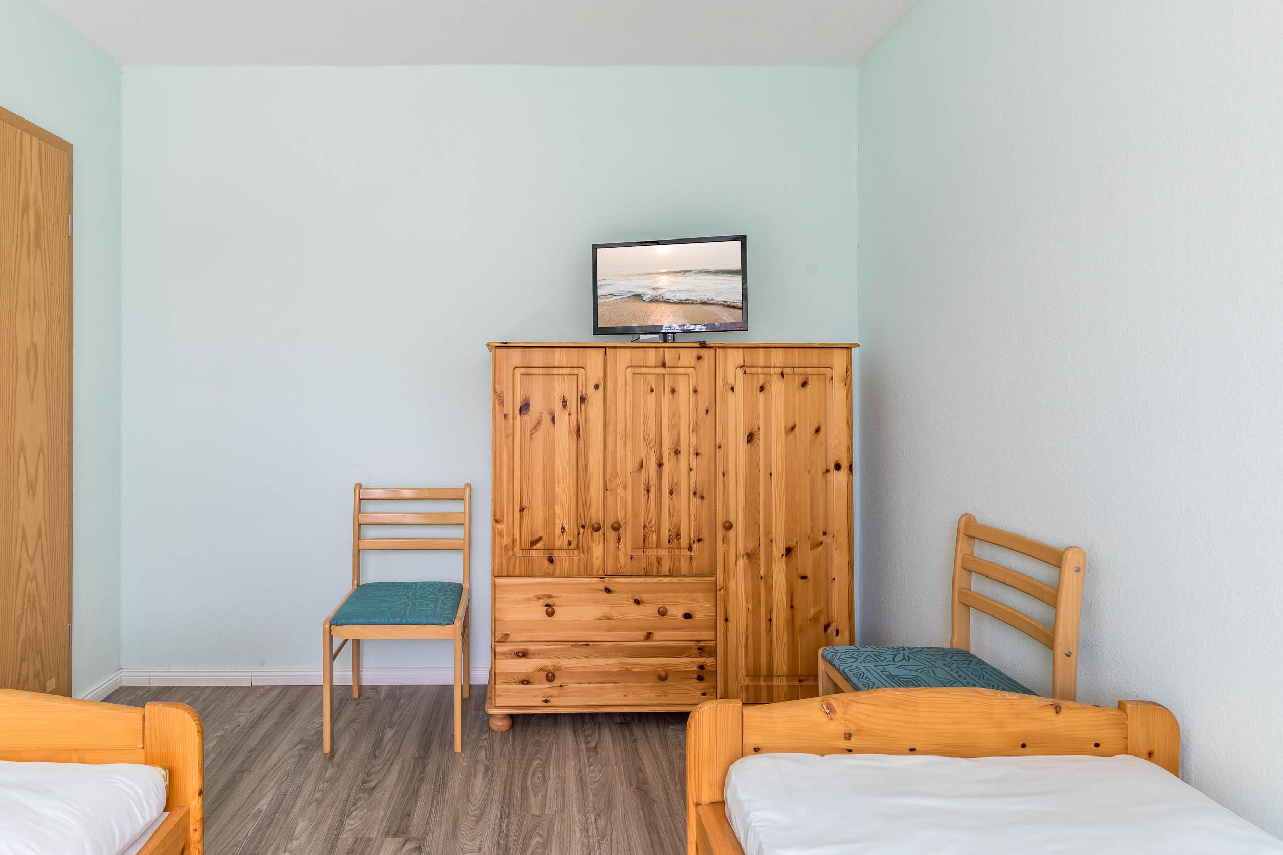 Die Unterkunft bietet zwei separate Schlafzimmer: In einem befindet sich ein Doppelbett mit kleinem Kleiderschrank für Ihre Garderobe. In dem Gästezimmer finden Sie 2 Einzelbetten, ebenfalls einen kleinen Kleiderschrank und einen 2. TV vor.
