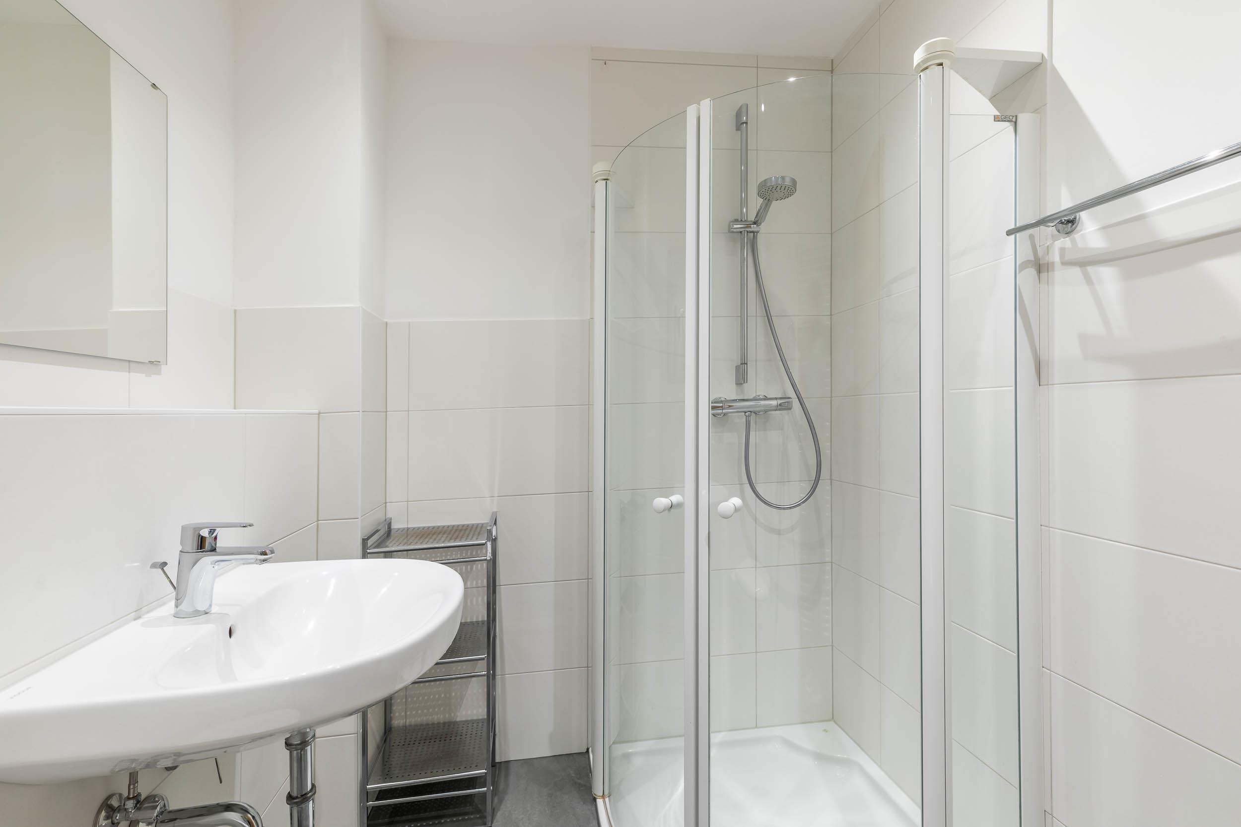 Im hell gefliesten Badezimmer finden Sie eine Dusche und WC.